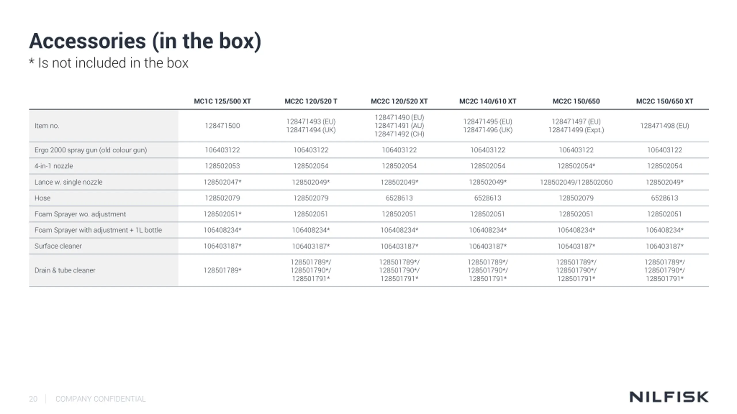 Accessories (in the box) * Is not included in the box MC1C 125/500 XT MC2C 120/520 T MC2C 120/520 XT MC2C 140/610 XT MC2C 150/650 MC2C 150/650 XT 128471490 (EU) 128471491 (AU) 128471492 (CH) 128471493 (EU) 128471494 (UK) 128471495 (EU) 128471496 (UK) 128471497 (EU) 128471499 (Expt.) Item no. 128471500 128471498 (EU) Ergo 2000 spray gun (old colour gun) 106403122 106403122 106403122 106403122 106403122 106403122 4-in-1 nozzle 128502053 128502054 128502054 128502054 128502054* 128502054 Lance w. single nozzle 128502047* 128502049* 128502049* 128502049* 128502049/128502050 128502049* Hose 128502079 128502079 6528613 6528613 128502079 6528613 Foam Sprayer wo. adjustment 128502051* 128502051 128502051 128502051 128502051 128502051 Foam Sprayer with adjustment + 1L bottle 106408234* 106408234* 106408234* 106408234* 106408234* 106408234* Surface cleaner 106403187* 106403187* 106403187* 106403187* 106403187* 106403187* 128501789*/ 128501790*/ 128501791* 128501789*/ 128501790*/ 128501791* 128501789*/ 128501790*/ 128501791* 128501789*/ 128501790*/ 128501791* 128501789*/ 128501790*/ 128501791* Drain & tube cleaner 128501789* 20 COMPANY CONFIDENTIAL