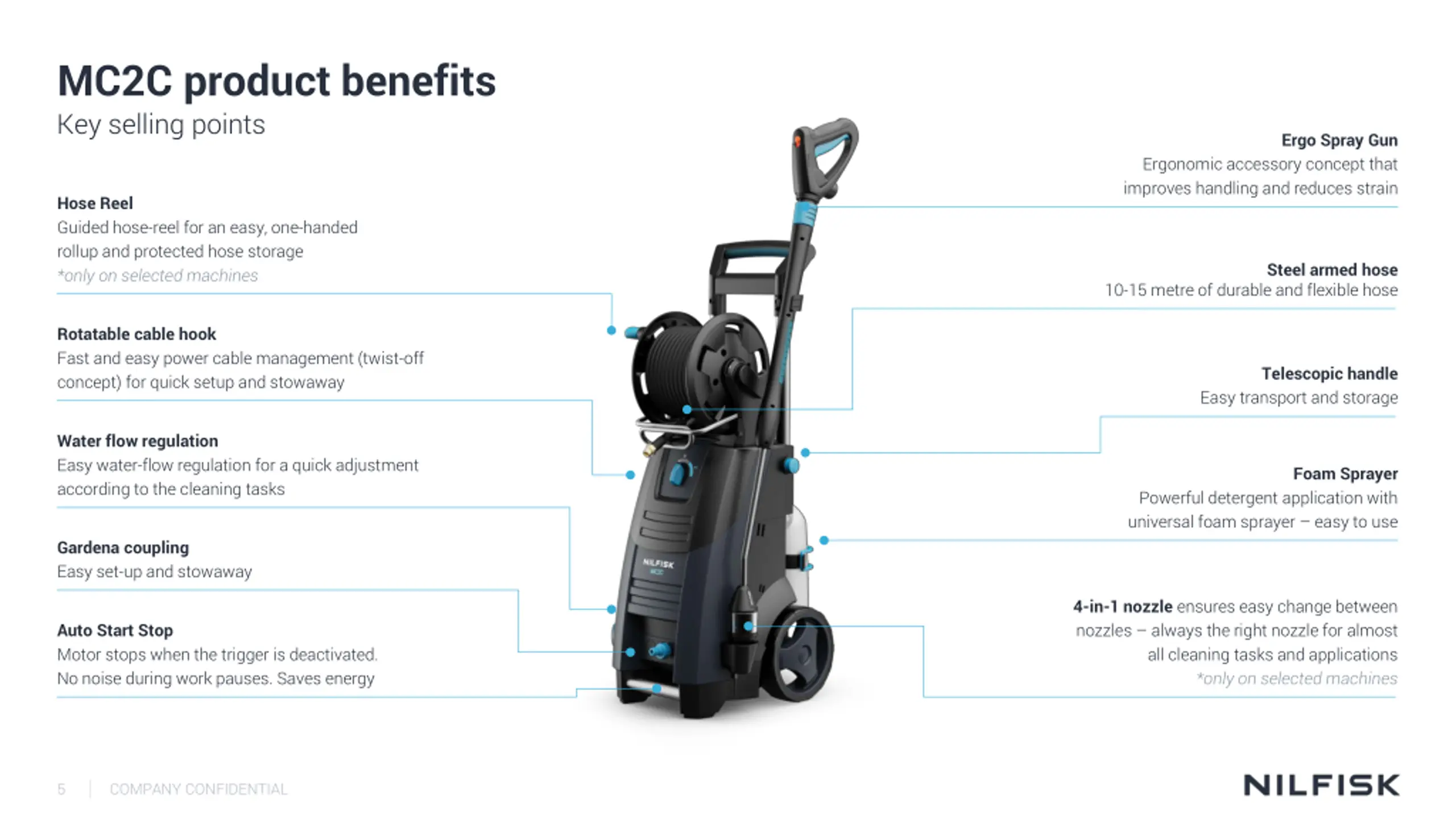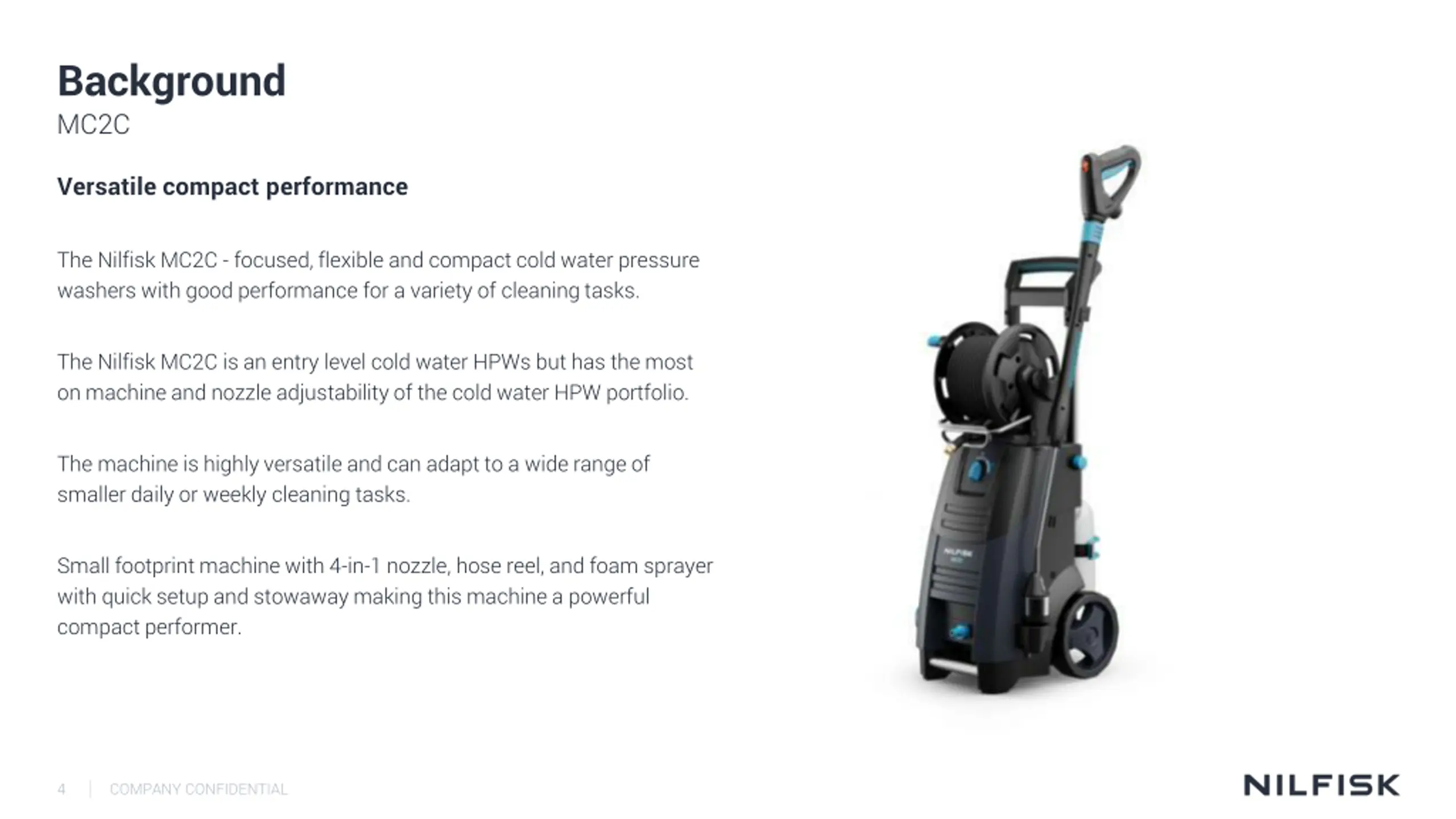 Background MC2C Versatile compact performance The Nilfisk MC2C - focused, flexible and compact cold water pressure washers with good performance for a variety of cleaning tasks. The Nilfisk MC2C is an entry level cold water HPWs but has the most on machine and nozzle adjustability of the cold water HPW portfolio. The machine is highly versatile and can adapt to a wide range of smaller daily or weekly cleaning tasks. Small footprint machine with 4-in-1 nozzle, hose reel, and foam sprayer with quick setup and stowaway making this machine a powerful compact performer. 4 COMPANY CONFIDENTIAL