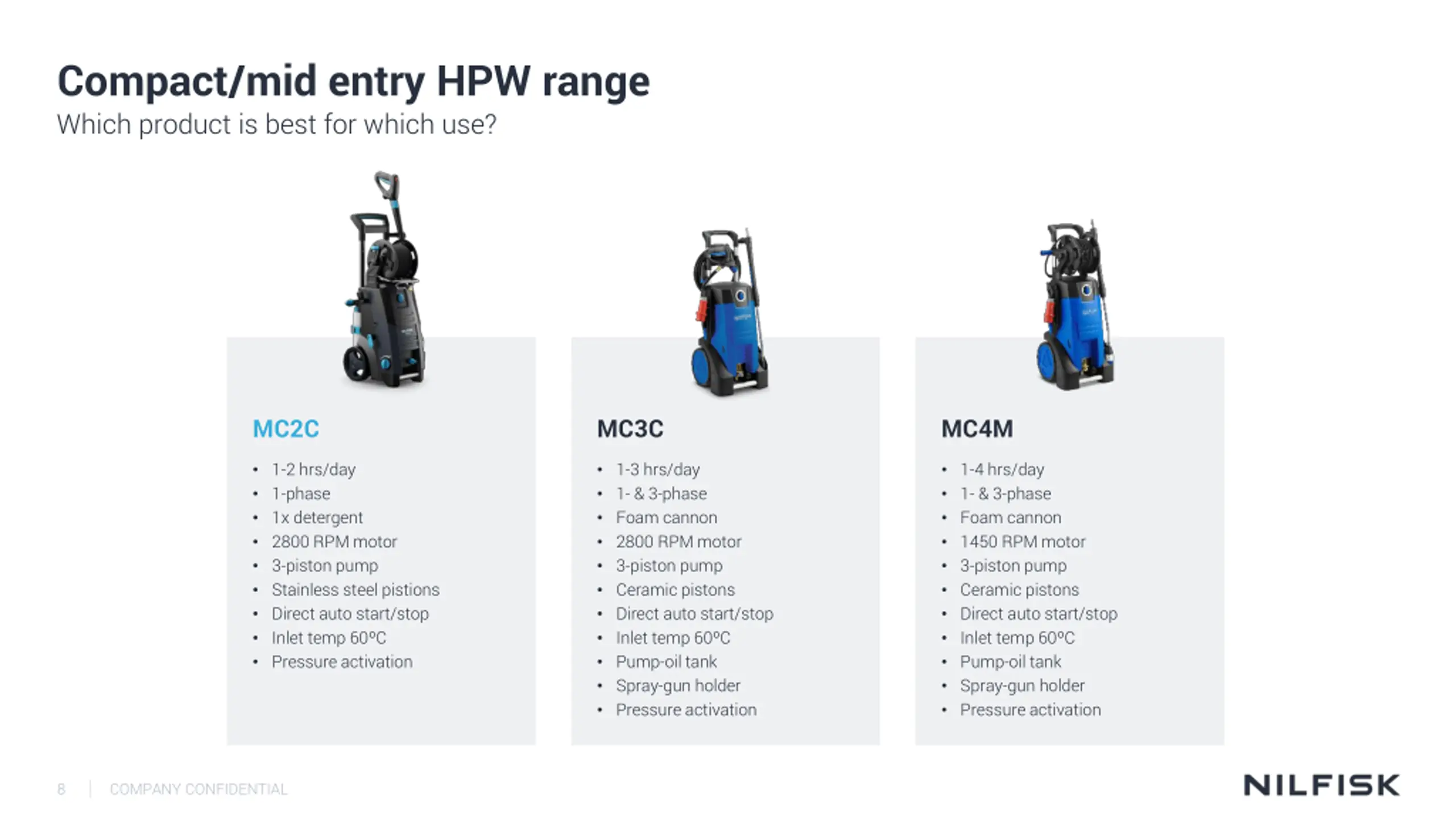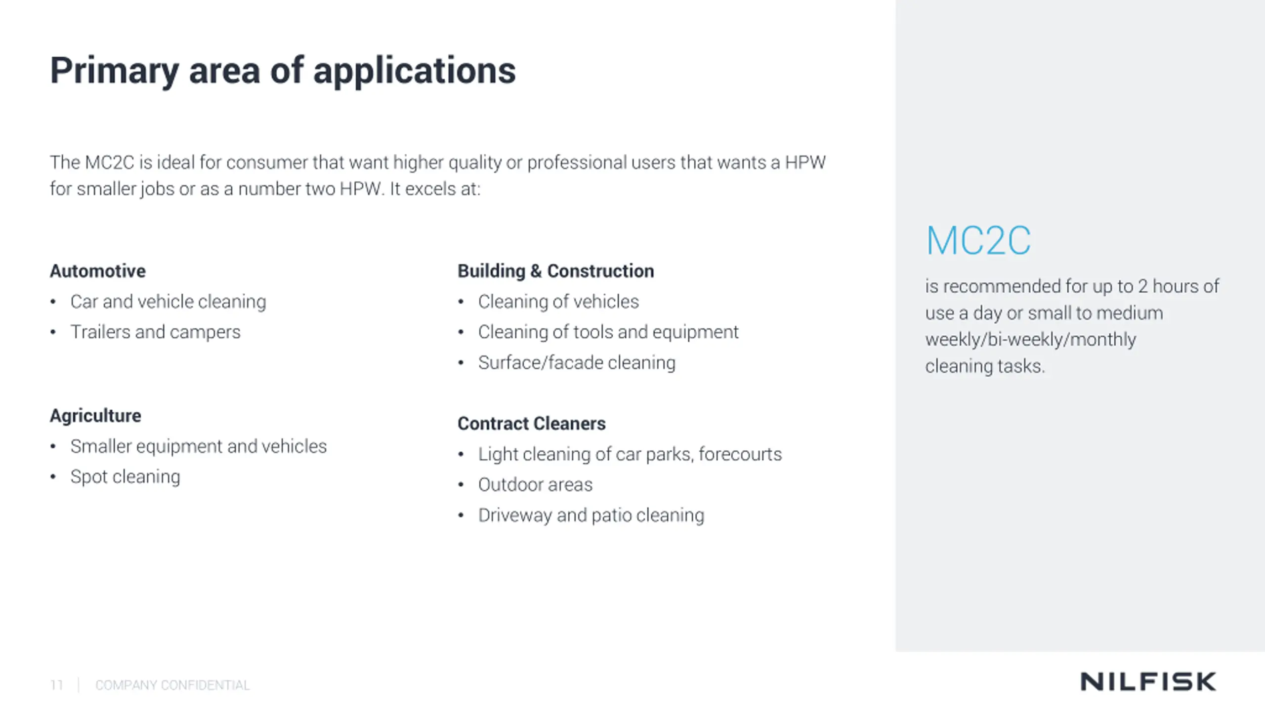 Primary area of applications The MC2C is ideal for consumer that want higher quality or professional users that wants a HPW for smaller jobs or as a number two HPW. It excels at: MC2C is recommended for up to 2 hours of use a day or small to medium weekly/bi-weekly/monthly cleaning tasks. Automotive Car and vehicle cleaning Trailers and campers Building & Construction Cleaning of vehicles Cleaning of tools and equipment Surface/facade cleaning Agriculture Smaller equipment and vehicles Spot cleaning Contract Cleaners Light cleaning of car parks, forecourts Outdoor areas Driveway and patio cleaning 11 COMPANY CONFIDENTIAL