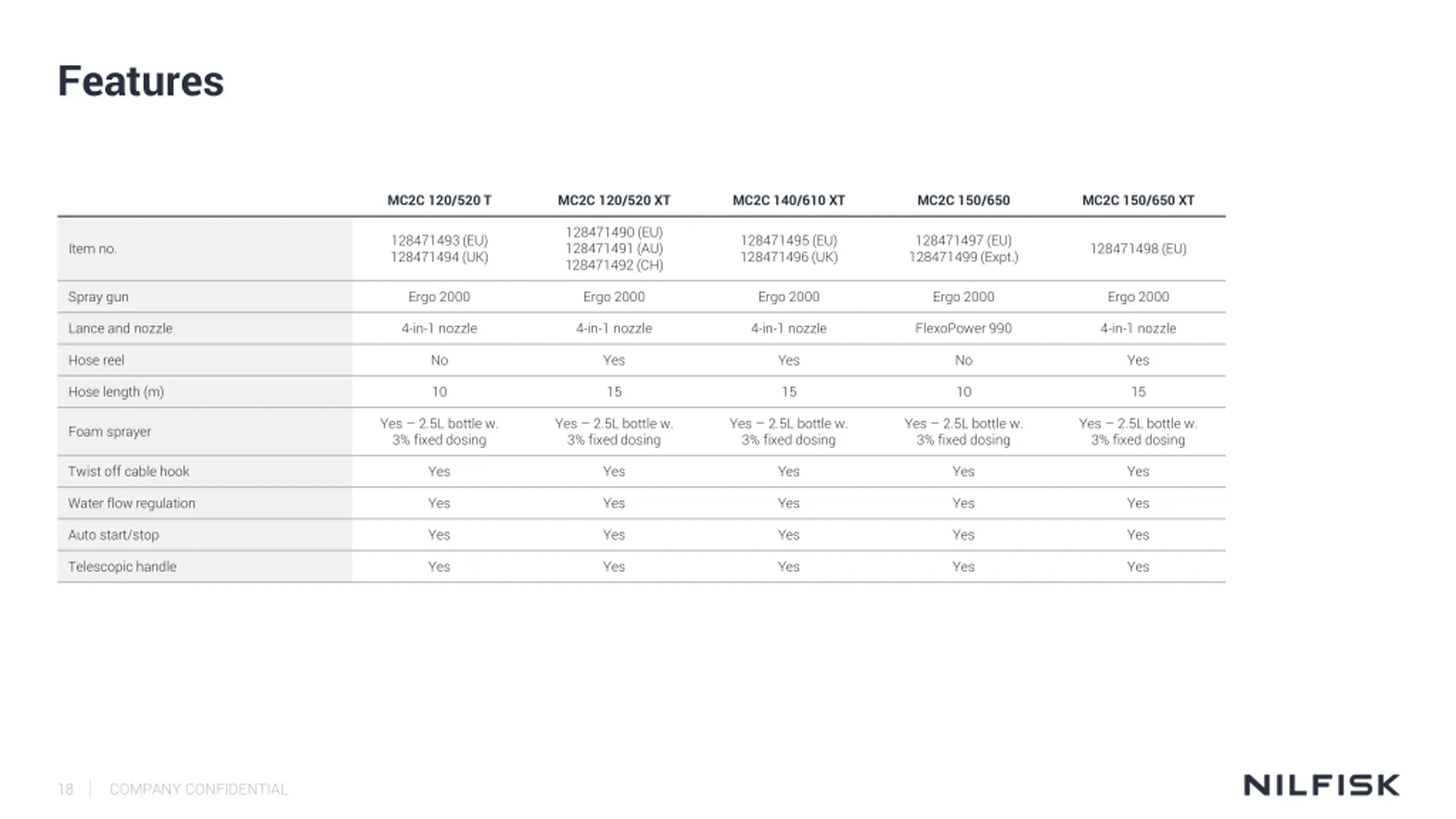 Features MC2C 120/520 T MC2C 120/520 XT MC2C 140/610 XT MC2C 150/650 MC2C 150/650 XT 128471490 (EU) 128471491 (AU) 128471492 (CH) 128471493 (EU) 128471494 (UK) 128471495 (EU) 128471496 (UK) 128471497 (EU) 128471499 (Expt.) Item no. 128471498 (EU) Spray gun Ergo 2000 Ergo 2000 Ergo 2000 Ergo 2000 Ergo 2000 Lance and nozzle 4-in-1 nozzle 4-in-1 nozzle 4-in-1 nozzle FlexoPower 990 4-in-1 nozzle Hose reel No Yes Yes No Yes Hose length (m) 10 15 15 10 15 Yes 2.5L bottle w. 3% fixed dosing Yes 2.5L bottle w. 3% fixed dosing Yes 2.5L bottle w. 3% fixed dosing Yes 2.5L bottle w. 3% fixed dosing Yes 2.5L bottle w. 3% fixed dosing Foam sprayer Twist off cable hook Yes Yes Yes Yes Yes Water flow regulation Yes Yes Yes Yes Yes Auto start/stop Yes Yes Yes Yes Yes Telescopic handle Yes Yes Yes Yes Yes 18 COMPANY CONFIDENTIAL