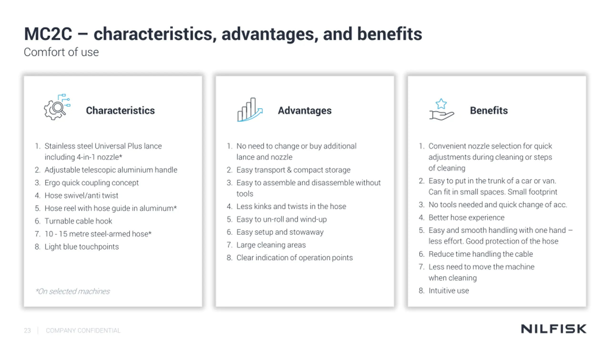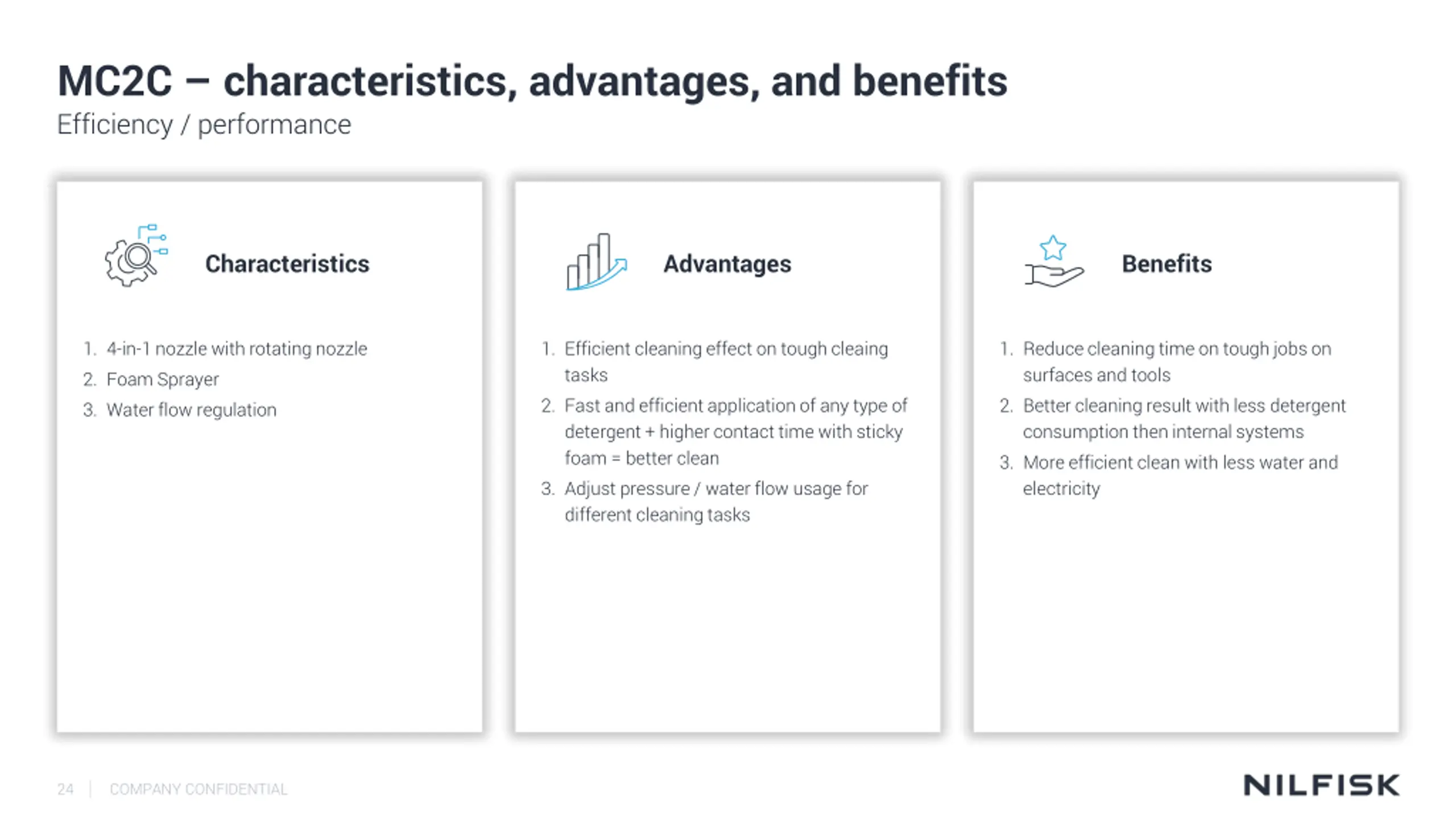 MC2C characteristics, advantages, and benefits Comfort of use Characteristics Advantages Benefits 1. Stainless steel Universal Plus lance including 4-in-1 nozzle* 2. Adjustable telescopic aluminium handle 3. Ergo quick coupling concept 4. Hose swivel/anti twist 5. Hose reel with hose guide in aluminum* 6. Turnable cable hook 7. 10 - 15 metre steel-armed hose* 8. Light blue touchpoints 1. No need to change or buy additional lance and nozzle 2. Easy transport & compact storage 3. Easy to assemble and disassemble without tools 4. Less kinks and twists in the hose 5. Easy to un-roll and wind-up 6. Easy setup and stowaway 7. Large cleaning areas 8. Clear indication of operation points 1. Convenient nozzle selection for quick adjustments during cleaning or steps of cleaning 2. Easy to put in the trunk of a car or van. Can fit in small spaces. Small footprint 3. No tools needed and quick change of acc. 4. Better hose experience 5. Easy and smooth handling with one hand less effort. Good protection of the hose 6. Reduce time handling the cable 7. Less need to move the machine when cleaning 8. Intuitive use *On selected machines 23 COMPANY CONFIDENTIAL
