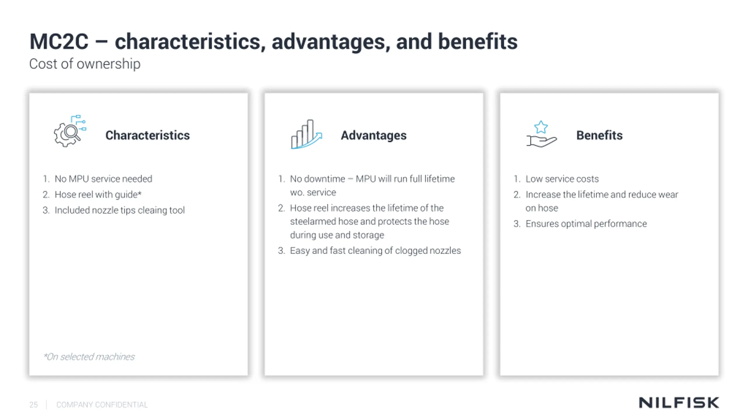 MC2C characteristics, advantages, and benefits Efficiency / performance Characteristics Advantages Benefits 1. 4-in-1 nozzle with rotating nozzle 2. Foam Sprayer 3. Water flow regulation 1. Efficient cleaning effect on tough cleaing tasks 2. Fast and efficient application of any type of detergent + higher contact time with sticky foam = better clean 3. Adjust pressure / water flow usage for different cleaning tasks 1. Reduce cleaning time on tough jobs on surfaces and tools 2. Better cleaning result with less detergent consumption then internal systems 3. More efficient clean with less water and electricity 24 COMPANY CONFIDENTIAL