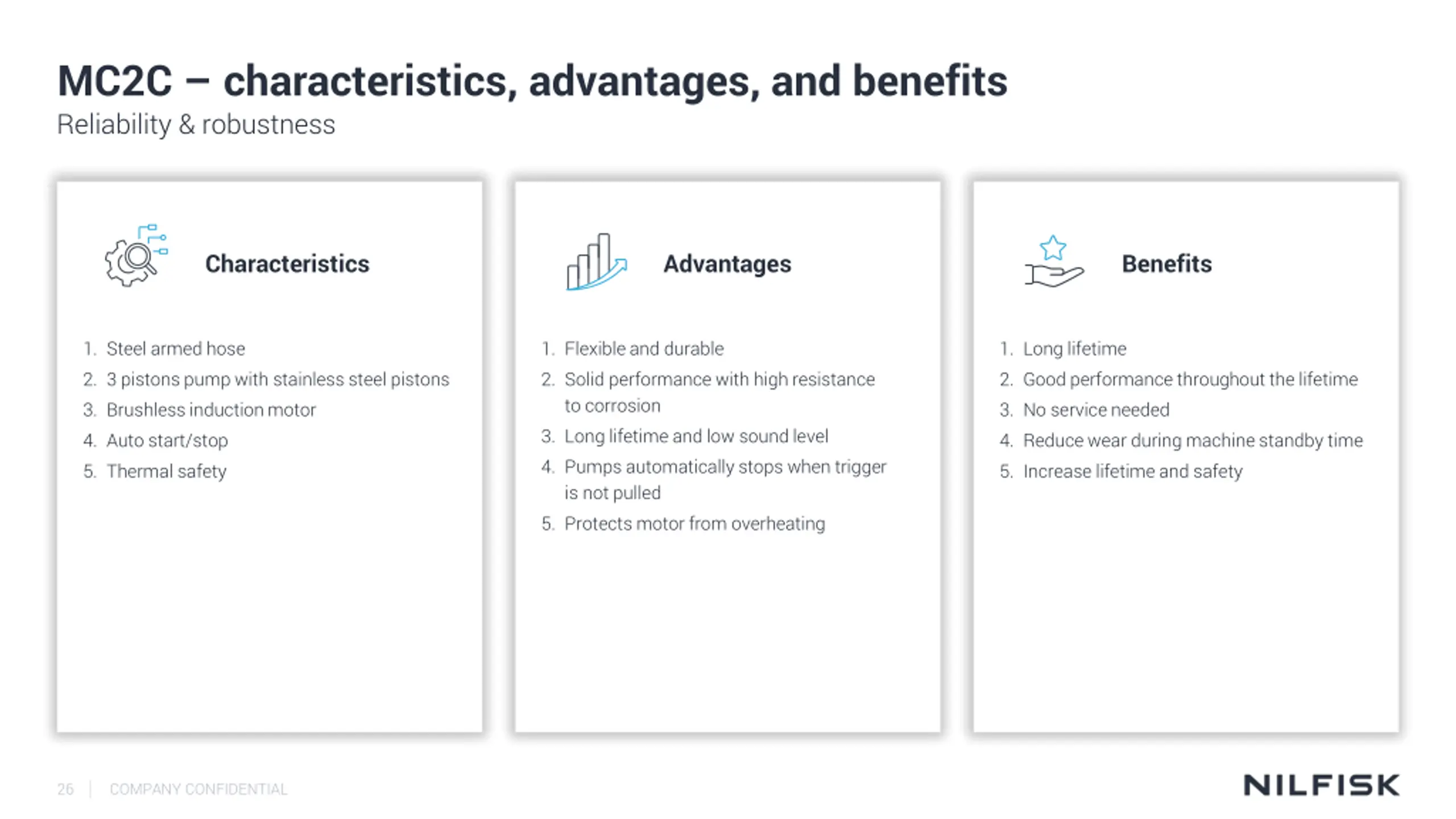 MC2C characteristics, advantages, and benefits Reliability & robustness Characteristics Advantages Benefits 1. Steel armed hose 2. 3 pistons pump with stainless steel pistons 3. Brushless induction motor 4. Auto start/stop 5. Thermal safety 1. Flexible and durable 2. Solid performance with high resistance to corrosion 3. Long lifetime and low sound level 4. Pumps automatically stops when trigger is not pulled 5. Protects motor from overheating 1. Long lifetime 2. Good performance throughout the lifetime 3. No service needed 4. Reduce wear during machine standby time 5. Increase lifetime and safety 26 COMPANY CONFIDENTIAL