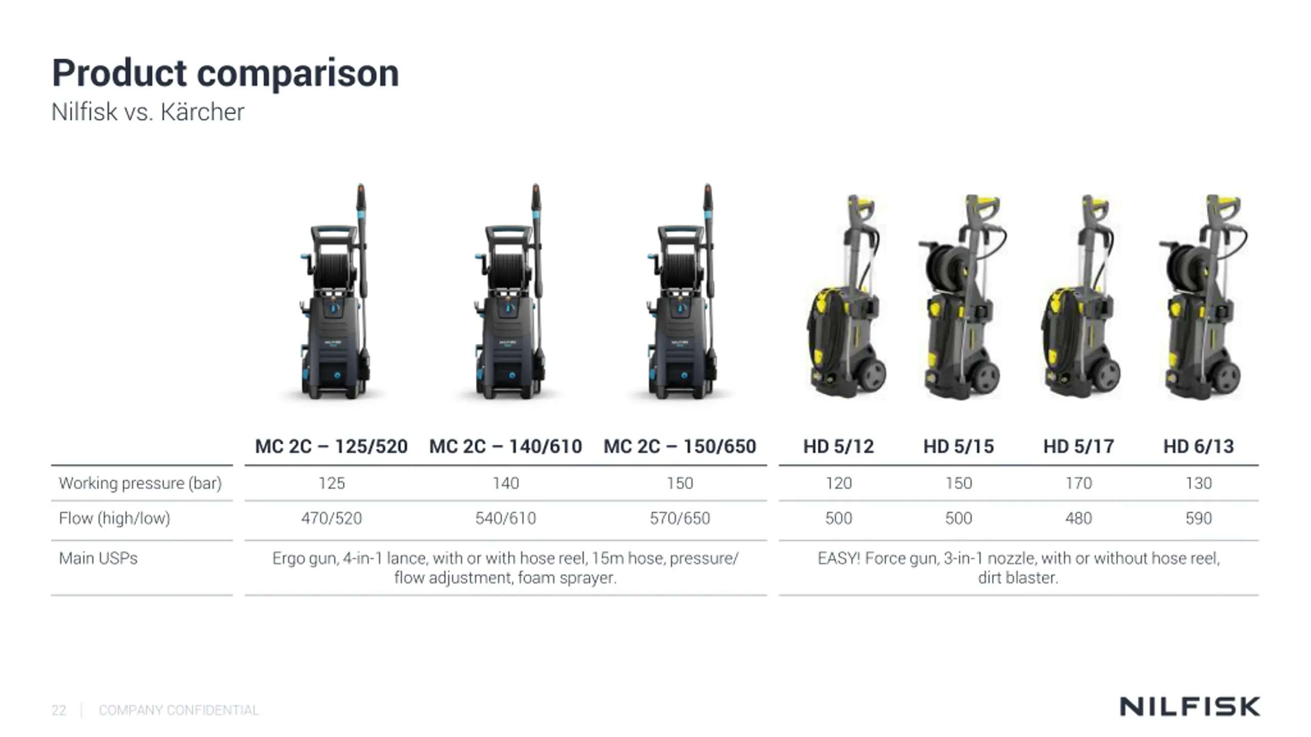 Product comparison Nilfisk vs. K rcher MC 2C 125/520 MC 2C 140/610 MC 2C 150/650 HD 5/12 HD 5/15 HD 5/17 HD 6/13 Working pressure (bar) 125 140 150 120 150 170 130 Flow (high/low) 470/520 540/610 570/650 500 500 480 590 Main USPs Ergo gun, 4-in-1 lance, with or with hose reel, 15m hose, pressure/ flow adjustment, foam sprayer. EASY! Force gun, 3-in-1 nozzle, with or without hose reel, dirt blaster. 22 COMPANY CONFIDENTIAL