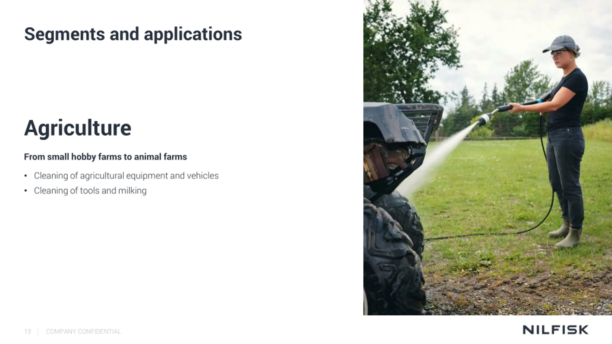 Segments and applications Automotive From small car cleaning business to garages or dealerships Cleaning of cars, vans, trailers Smaller jobs such as engine bays, wheels, or undercarriage* * In combination with detergent if hot water is not preferred 12 COMPANY CONFIDENTIAL