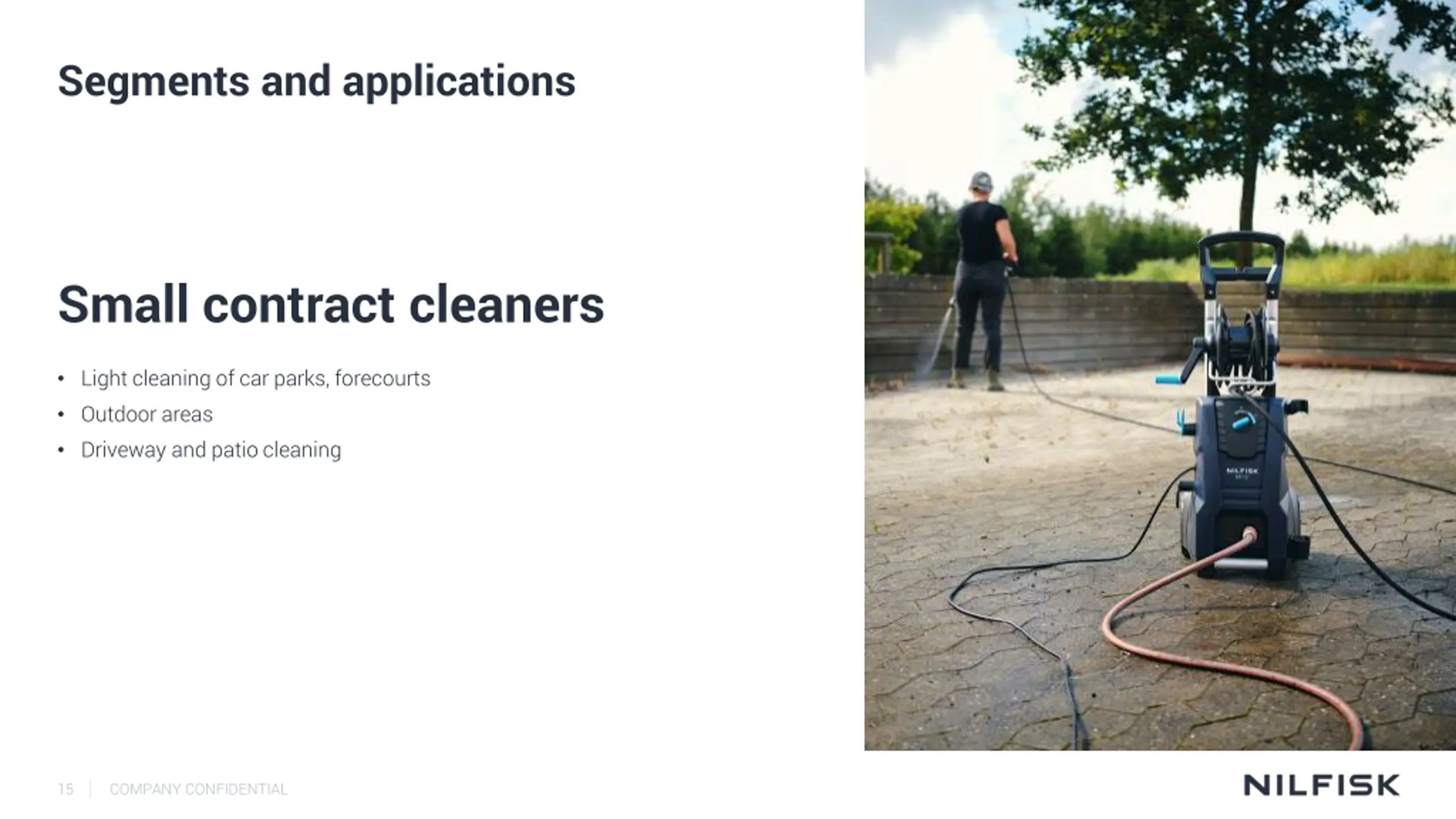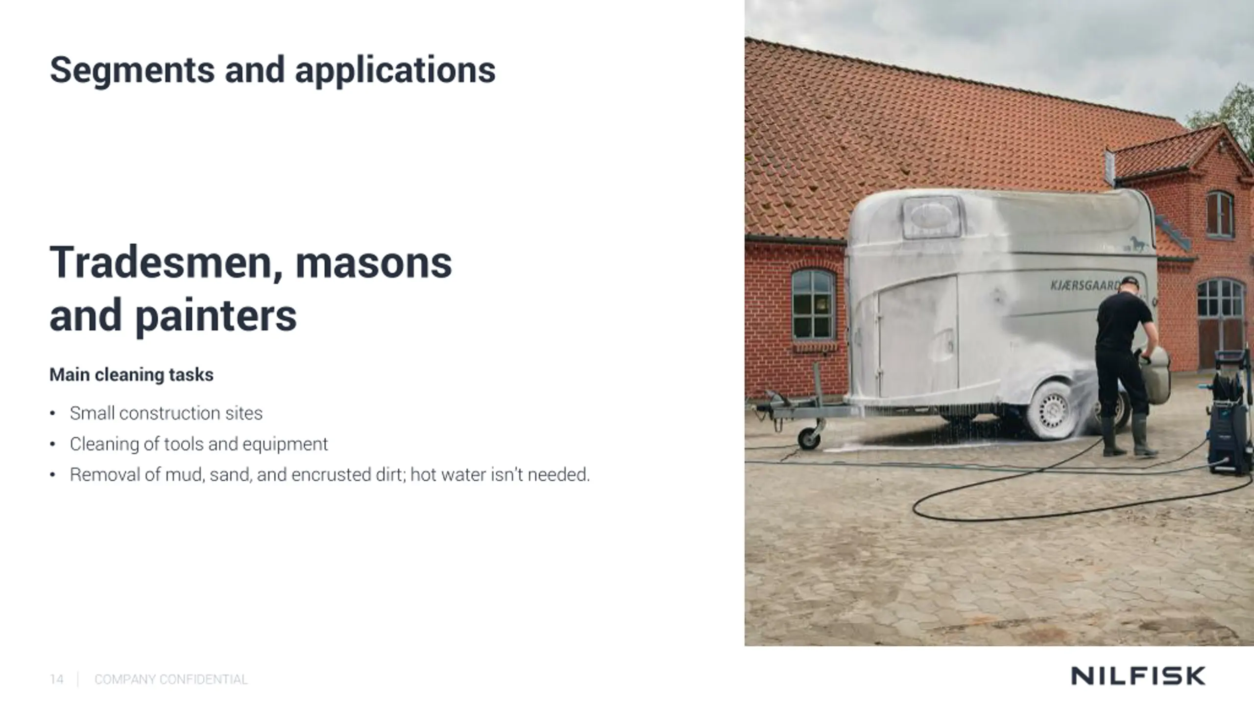 Segments and applications Tradesmen, masons and painters Main cleaning tasks Small construction sites Cleaning of tools and equipment Removal of mud, sand, and encrusted dirt; hot water isn t needed. 14 COMPANY CONFIDENTIAL