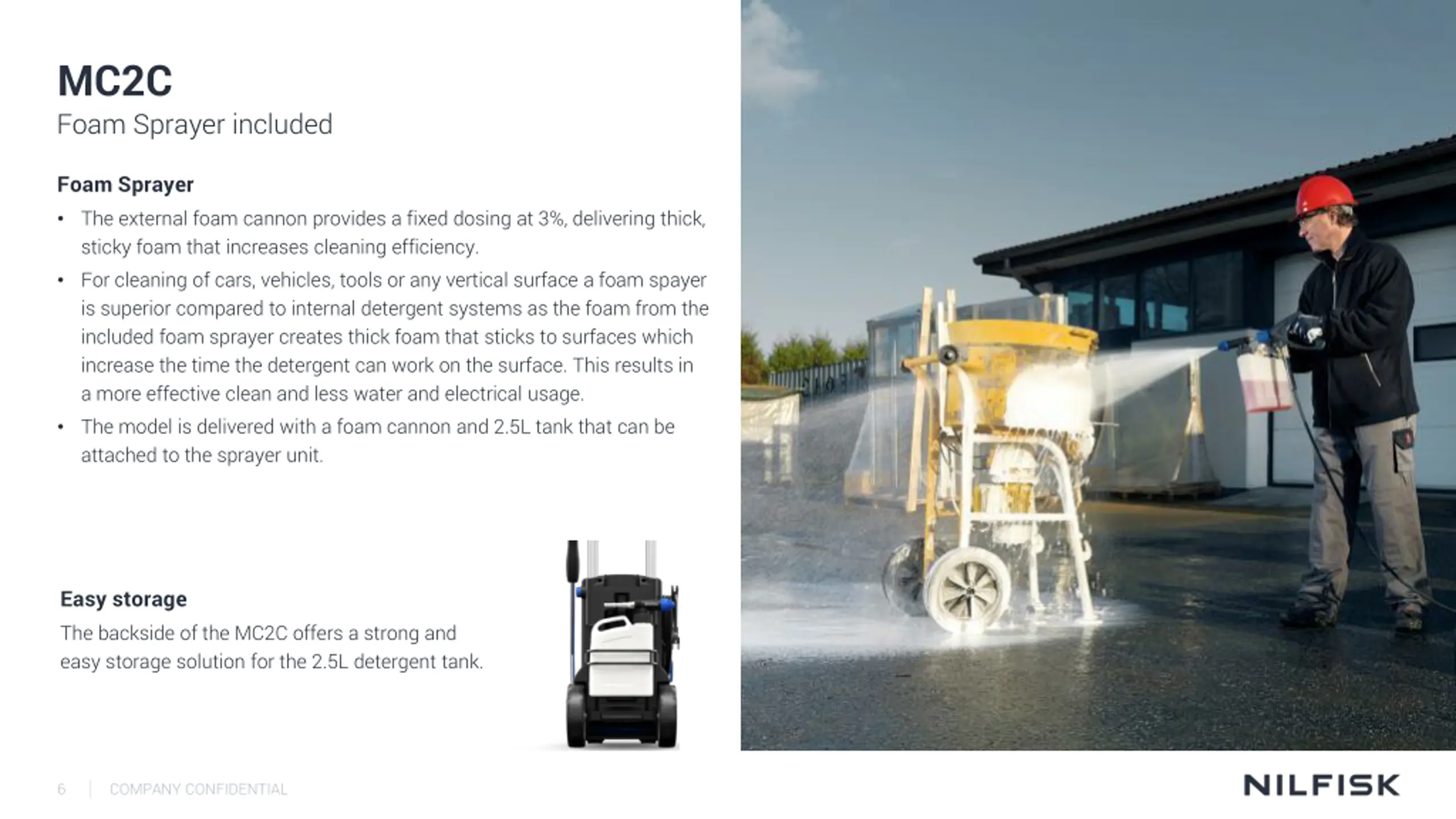 MC2C Foam Sprayer included Foam Sprayer The external foam cannon provides a fixed dosing at 3%, delivering thick, sticky foam that increases cleaning efficiency. For cleaning of cars, vehicles, tools or any vertical surface a foam spayer is superior compared to internal detergent systems as the foam from the included foam sprayer creates thick foam that sticks to surfaces which increase the time the detergent can work on the surface. This results in a more effective clean and less water and electrical usage. The model is delivered with a foam cannon and 2.5L tank that can be attached to the sprayer unit. Easy storage The backside of the MC2C offers a strong and easy storage solution for the 2.5L detergent tank. 6 COMPANY CONFIDENTIAL