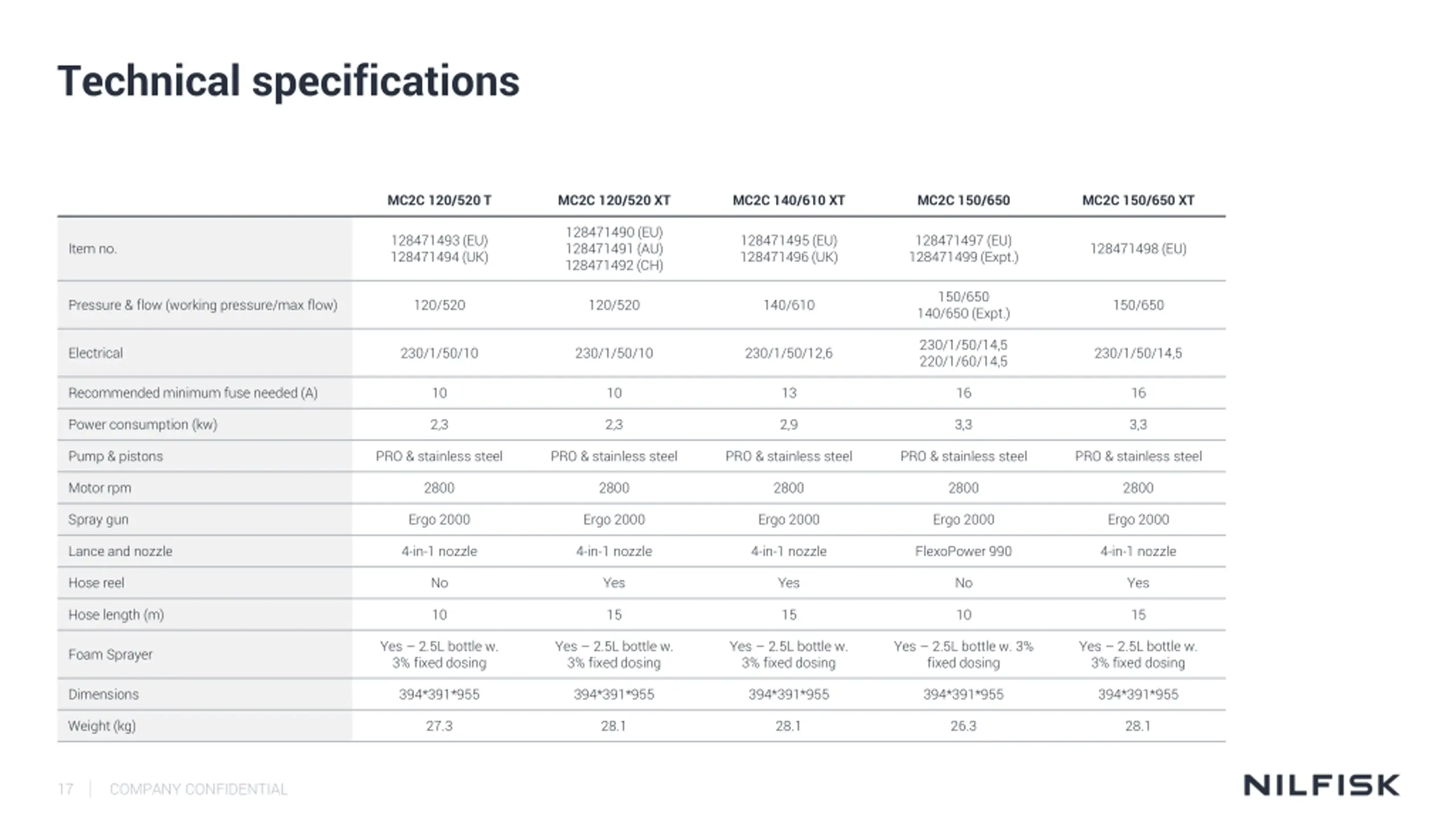 Technical specifications MC2C 120/520 T MC2C 120/520 XT MC2C 140/610 XT MC2C 150/650 MC2C 150/650 XT 128471490 (EU) 128471491 (AU) 128471492 (CH) 128471493 (EU) 128471494 (UK) 128471495 (EU) 128471496 (UK) 128471497 (EU) 128471499 (Expt.) Item no. 128471498 (EU) 150/650 140/650 (Expt.) Pressure & flow (working pressure/max flow) 120/520 120/520 140/610 150/650 230/1/50/14,5 220/1/60/14,5 Electrical 230/1/50/10 230/1/50/10 230/1/50/12,6 230/1/50/14,5 Recommended minimum fuse needed (A) 10 10 13 16 16 Power consumption (kw) 2,3 2,3 2,9 3,3 3,3 Pump & pistons PRO & stainless steel PRO & stainless steel PRO & stainless steel PRO & stainless steel PRO & stainless steel Motor rpm 2800 2800 2800 2800 2800 Spray gun Ergo 2000 Ergo 2000 Ergo 2000 Ergo 2000 Ergo 2000 Lance and nozzle 4-in-1 nozzle 4-in-1 nozzle 4-in-1 nozzle FlexoPower 990 4-in-1 nozzle Hose reel No Yes Yes No Yes Hose length (m) 10 15 15 10 15 Yes 2.5L bottle w. 3% fixed dosing Yes 2.5L bottle w. 3% fixed dosing Yes 2.5L bottle w. 3% fixed dosing Yes 2.5L bottle w. 3% fixed dosing Yes 2.5L bottle w. 3% fixed dosing Foam Sprayer Dimensions 394*391*955 394*391*955 394*391*955 394*391*955 394*391*955 Weight (kg) 27.3 28.1 28.1 26.3 28.1 17 COMPANY CONFIDENTIAL