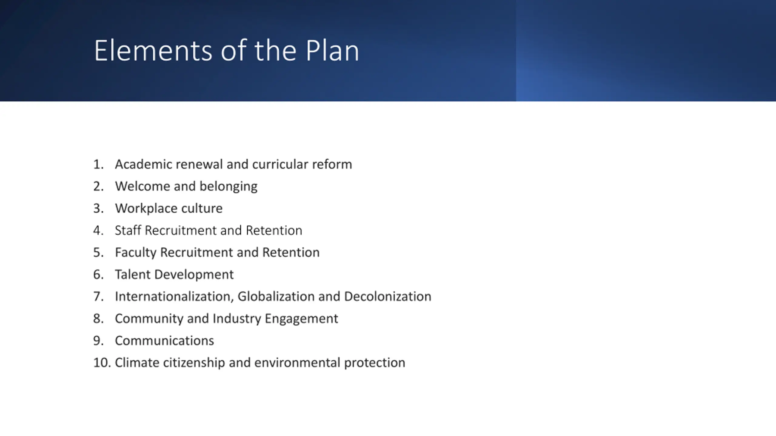 Elements of the Plan 1. Academic renewal and curricular reform 2. Welcome and belonging 3. Workplace culture 4. Staff Recruitment and Retention 5. Faculty Recruitment and Retention 6. Talent Development 7. Internationalization, Globalization and Decolonization 8. Community and Industry Engagement 9. Communications 10. Climate citizenship and environmental protection