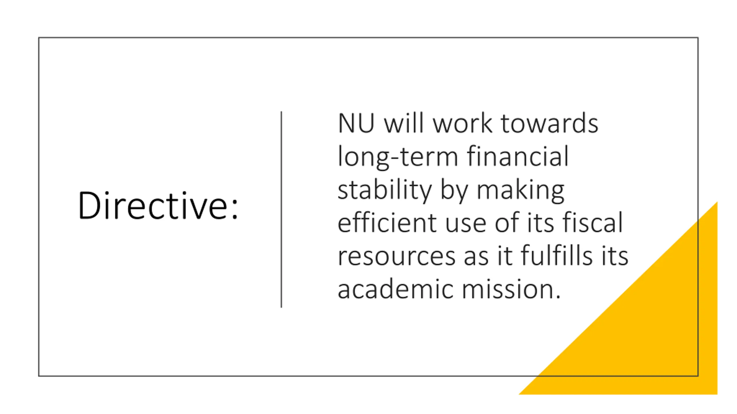 NU will work towards long-term financial stability by making efficient use of its fiscal resources as it fulfills its academic mission. Directive: