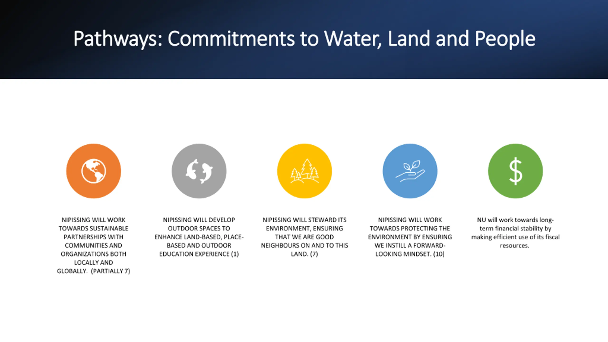 Pathways: Commitments to Water, Land and People Pathways: Commitments to Water, Land and People NIPISSING WILL WORK TOWARDS SUSTAINABLE PARTNERSHIPS WITH COMMUNITIES AND ORGANIZATIONS BOTH LOCALLY AND GLOBALLY. (PARTIALLY 7) NIPISSING WILL DEVELOP OUTDOOR SPACES TO ENHANCE LAND-BASED, PLACE- BASED AND OUTDOOR EDUCATION EXPERIENCE (1) NIPISSING WILL STEWARD ITS ENVIRONMENT, ENSURING THAT WE ARE GOOD NEIGHBOURS ON AND TO THIS LAND. (7) NIPISSING WILL WORK TOWARDS PROTECTING THE ENVIRONMENT BY ENSURING WE INSTILL A FORWARD- LOOKING MINDSET. (10) NU will work towards long- term financial stability by making efficient use of its fiscal resources.