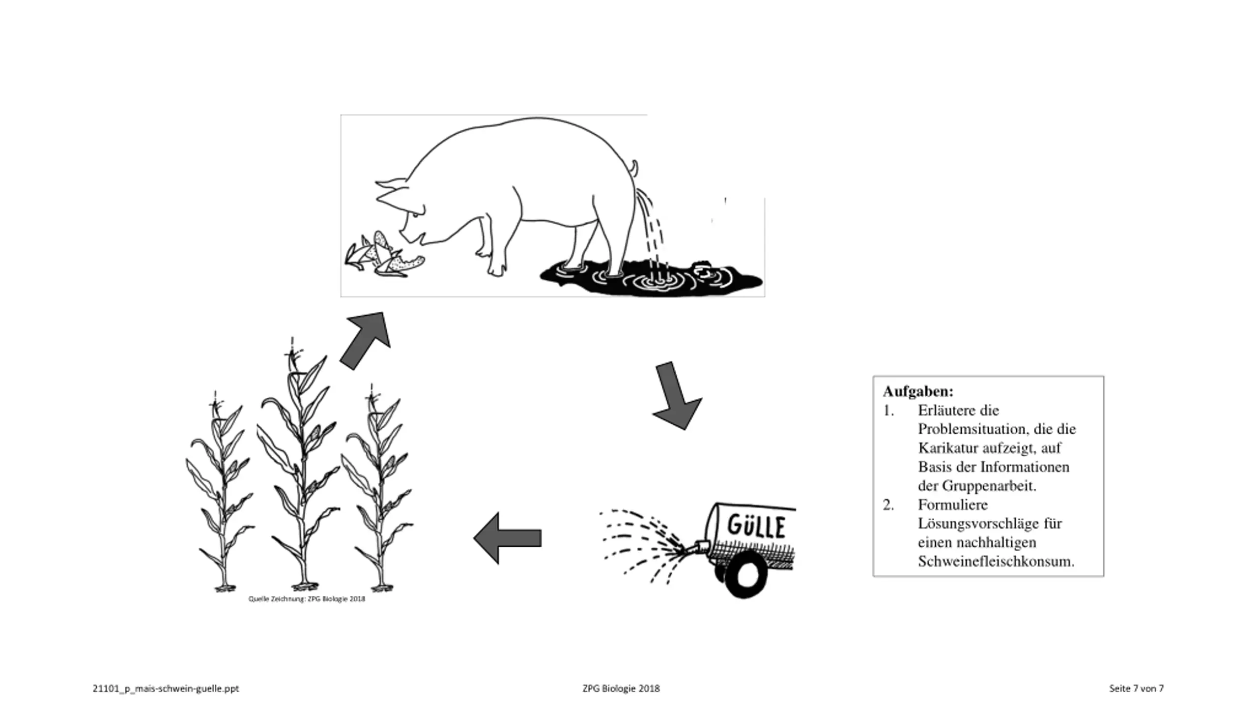 Aufgaben: 1. Erl utere die Problemsituation, die die Karikatur aufzeigt, auf Basis der Informationen der Gruppenarbeit. 2. Formuliere L sungsvorschl ge f r einen nachhaltigen Schweinefleischkonsum. Quelle Zeichnung: ZPG Biologie 2018 21101_p_mais-schwein-guelle.ppt ZPG Biologie 2018 Seite 7 von 7