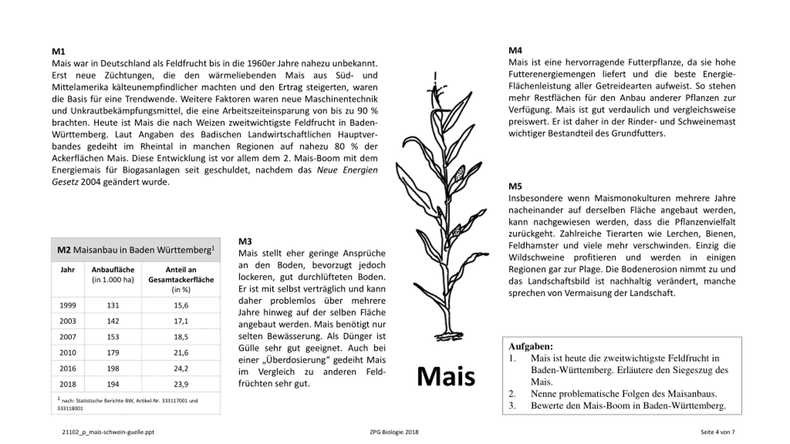 M4 Mais ist eine hervorragende Futterpflanze, da sie hohe Futterenergiemengen liefert und die beste Energie- Fl chenleistung aller Getreidearten aufweist. So stehen mehr Restfl chen f r den Anbau anderer Pflanzen zur Verf gung. Mais ist gut verdaulich und vergleichsweise preiswert. Er ist daher in der Rinder- und Schweinemast wichtiger Bestandteil des Grundfutters. M1 Mais war in Deutschland als Feldfrucht bis in die 1960er Jahre nahezu unbekannt. Erst neue Z chtungen, die den w rmeliebenden Mais aus S d- und Mittelamerika k lteunempfindlicher machten und den Ertrag steigerten, waren die Basis f r eine Trendwende. Weitere Faktoren waren neue Maschinentechnik und Unkrautbek mpfungsmittel, die eine Arbeitszeiteinsparung von bis zu 90 % brachten. Heute ist Mais die nach Weizen zweitwichtigste Feldfrucht in Baden- W rttemberg. Laut Angaben des Badischen Landwirtschaftlichen Hauptver- bandes gedeiht im Rheintal in manchen Regionen auf nahezu 80 % der Ackerfl chen Mais. Diese Entwicklung ist vor allem dem 2. Mais-Boom mit dem Energiemais f r Biogasanlagen seit geschuldet, nachdem das Neue Energien Gesetz 2004 ge ndert wurde. M5 Insbesondere wenn Maismonokulturen mehrere Jahre nacheinander auf derselben Fl che angebaut werden, kann nachgewiesen werden, dass die Pflanzenvielfalt zur ckgeht. Zahlreiche Tierarten wie Lerchen, Bienen, Feldhamster und viele mehr verschwinden. Einzig die Wildschweine profitieren und werden in einigen Regionen gar zur Plage. Die Bodenerosion nimmt zu und das Landschaftsbild ist nachhaltig ver ndert, manche sprechen von Vermaisung der Landschaft. M3 Mais stellt eher geringe Anspr che an den Boden, bevorzugt jedoch lockeren, gut durchl fteten Boden. Er ist mit selbst vertr glich und kann daher problemlos ber mehrere Jahre hinweg auf der selben Fl che angebaut werden. Mais ben tigt nur selten Bew sserung. Als D nger ist G lle sehr gut geeignet. Auch bei einer berdosierung gedeiht Mais im Vergleich zu anderen Feld- fr chten sehr gut. M2 Maisanbau in Baden W rttemberg1 Jahr Anbaufl che (in 1.000 ha) Anteil an Gesamtackerfl che (in %) 1999 131 15,6 2003 142 17,1 2007 153 18,5 Aufgaben: 1. Mais ist heute die zweitwichtigste Feldfrucht in Baden-W rttemberg. Erl utere den Siegeszug des Mais. 2. Nenne problematische Folgen des Maisanbaus. 3. Bewerte den Mais-Boom in Baden-W rttemberg. 2010 179 21,6 Mais 2016 198 24,2 2018 194 23,9 1nach: Statistische Berichte BW, Artikel-Nr. 333117001 und 333118001 21102_p_mais-schwein-guelle.ppt ZPG Biologie 2018 Seite 4 von 7
