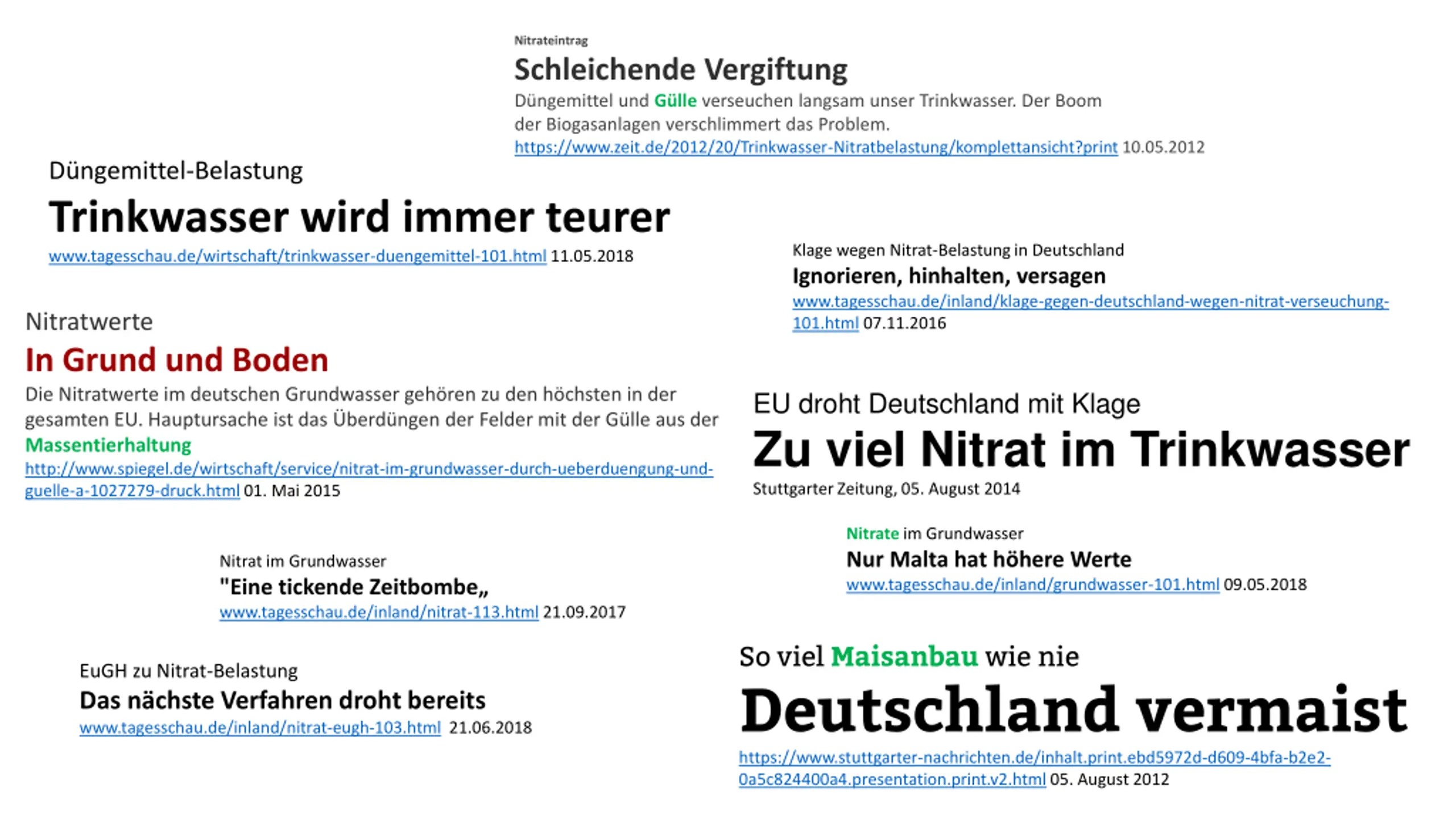 Nitrateintrag Schleichende Vergiftung D ngemittel und G lle verseuchen langsam unser Trinkwasser. Der Boom der Biogasanlagen verschlimmert das Problem. https://www.zeit.de/2012/20/Trinkwasser-Nitratbelastung/komplettansicht?print 10.05.2012 D ngemittel-Belastung Trinkwasser wird immer teurer www.tagesschau.de/wirtschaft/trinkwasser-duengemittel-101.html 11.05.2018 Klage wegen Nitrat-Belastung in Deutschland Ignorieren, hinhalten, versagen www.tagesschau.de/inland/klage-gegen-deutschland-wegen-nitrat-verseuchung- 101.html 07.11.2016 Nitratwerte In Grund und Boden Die Nitratwerte im deutschen Grundwasser geh ren zu den h chsten in der gesamten EU. Hauptursache ist das berd ngen der Felder mit der G lle aus der Massentierhaltung http://www.spiegel.de/wirtschaft/service/nitrat-im-grundwasser-durch-ueberduengung-und- guelle-a-1027279-druck.html 01. Mai 2015 EU droht Deutschland mit Klage Zu viel Nitrat im Trinkwasser Stuttgarter Zeitung, 05. August 2014 Nitrate im Grundwasser Nur Malta hat h here Werte www.tagesschau.de/inland/grundwasser-101.html 09.05.2018 Nitrat im Grundwasser "Eine tickende Zeitbombe www.tagesschau.de/inland/nitrat-113.html 21.09.2017 So viel Maisanbau wie nie Deutschland vermaist https://www.stuttgarter-nachrichten.de/inhalt.print.ebd5972d-d609-4bfa-b2e2- 0a5c824400a4.presentation.print.v2.html 05. August 2012 EuGH zu Nitrat-Belastung Das n chste Verfahren droht bereits www.tagesschau.de/inland/nitrat-eugh-103.html 21.06.2018