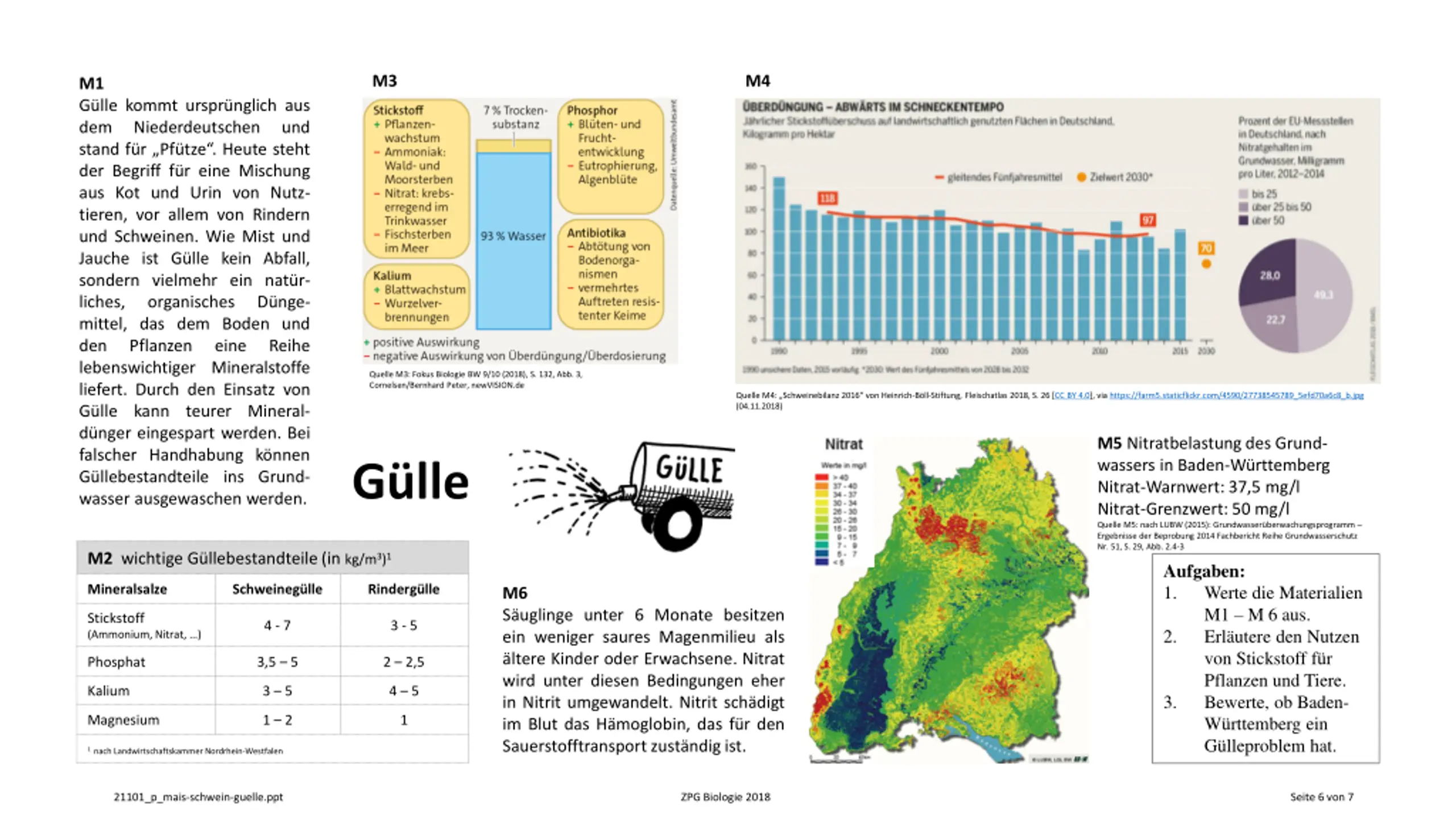M3 M4 M1 G lle kommt urspr nglich aus dem Niederdeutschen stand f r Pf tze . Heute steht der Begriff f r eine Mischung aus Kot und Urin von Nutz- tieren, vor allem von Rindern und Schweinen. Wie Mist und Jauche ist G lle kein Abfall, sondern vielmehr ein nat r- liches, organisches mittel, das dem Boden und den Pflanzen lebenswichtiger Mineralstoffe liefert. Durch den Einsatz von G lle kann teurer Mineral- d nger eingespart werden. Bei falscher Handhabung k nnen G llebestandteile ins Grund- wasser ausgewaschen werden. und D nge- eine Reihe Quelle M3: Fokus Biologie BW 9/10 (2018), S. 132, Abb. 3, Cornelsen/Bernhard Peter, newVISION.de Quelle M4: Schweinebilanz 2016 von Heinrich-B ll-Stiftung, Fleischatlas 2018, S. 26 [CC BY 4.0], via https://farm5.staticflickr.com/4590/27738545789_5efd70a6c8_b.jpg (04.11.2018) M5 Nitratbelastung des Grund- wassers in Baden-W rttemberg Nitrat-Warnwert: 37,5 mg/l Nitrat-Grenzwert: 50 mg/l Quelle M5: nach LUBW (2015): Grundwasser berwachungsprogramm Ergebnisse der Beprobung 2014 Fachbericht Reihe Grundwasserschutz Nr. 51, S. 29, Abb. 2.4-3 G lle M2 wichtige G llebestandteile (in kg/m3)1 Aufgaben: 1. Werte die Materialien M1 M 6 aus. 2. Erl utere den Nutzen von Stickstoff f r Pflanzen und Tiere. 3. Bewerte, ob Baden- W rttemberg ein G lleproblem hat. Mineralsalze Schweineg lle Rinderg lle M6 S uglinge unter 6 Monate besitzen ein weniger saures Magenmilieu als ltere Kinder oder Erwachsene. Nitrat wird unter diesen Bedingungen eher in Nitrit umgewandelt. Nitrit sch digt im Blut das H moglobin, das f r den Sauerstofftransport zust ndig ist. Stickstoff (Ammonium, Nitrat, ) 4 - 7 3 - 5 Phosphat 3,5 5 2 2,5 Kalium 3 5 4 5 Magnesium 1 2 1 1nach Landwirtschaftskammer Nordrhein-Westfalen 21101_p_mais-schwein-guelle.ppt ZPG Biologie 2018 Seite 6 von 7