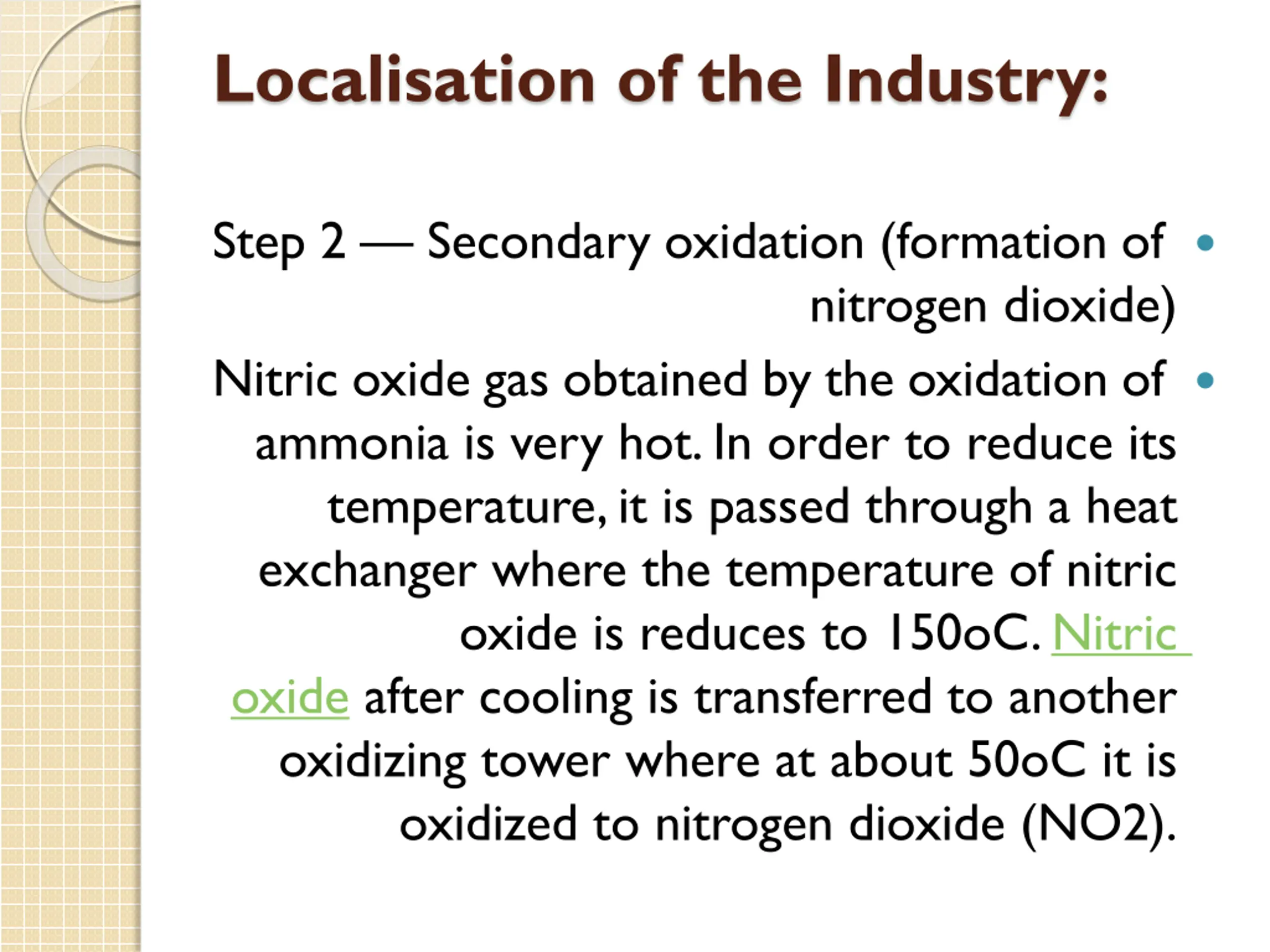 Localisation of the Industry: Step 2 Secondary oxidation (formation of nitrogen dioxide) Nitric oxide gas obtained by the oxidation of ammonia is very hot. In order to reduce its temperature, it is passed through a heat exchanger where the temperature of nitric oxide is reduces to 150oC.Nitric oxide after cooling is transferred to another oxidizing tower where at about 50oC it is oxidized to nitrogen dioxide (NO2).