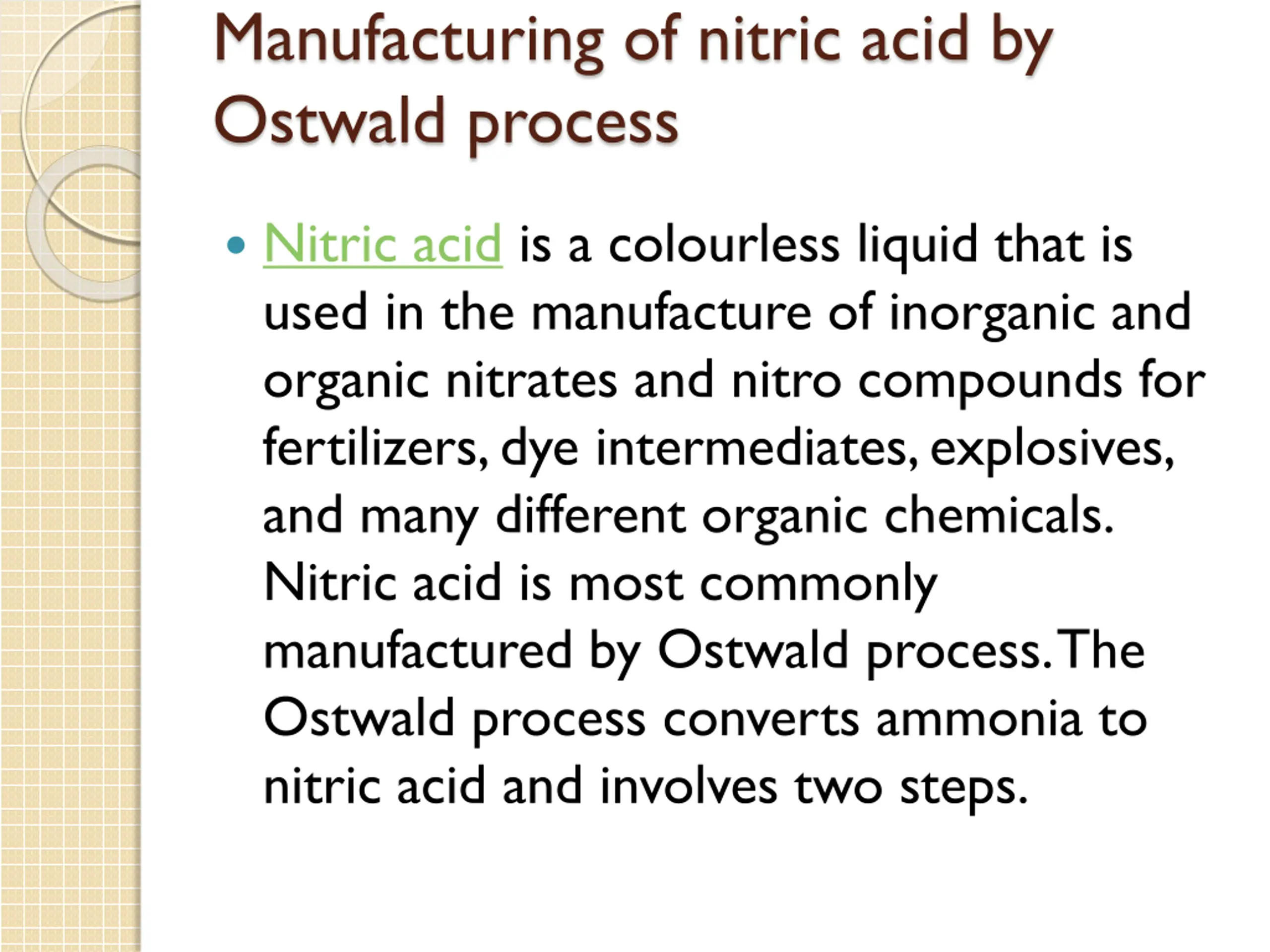 Manufacturing of nitric acid by Ostwald process Nitric acid is a colourless liquid that is used in the manufacture of inorganic and organic nitrates and nitro compounds for fertilizers, dye intermediates, explosives, and many different organic chemicals. Nitric acid is most commonly manufactured by Ostwald process. The Ostwald process converts ammonia to nitric acid and involves two steps.