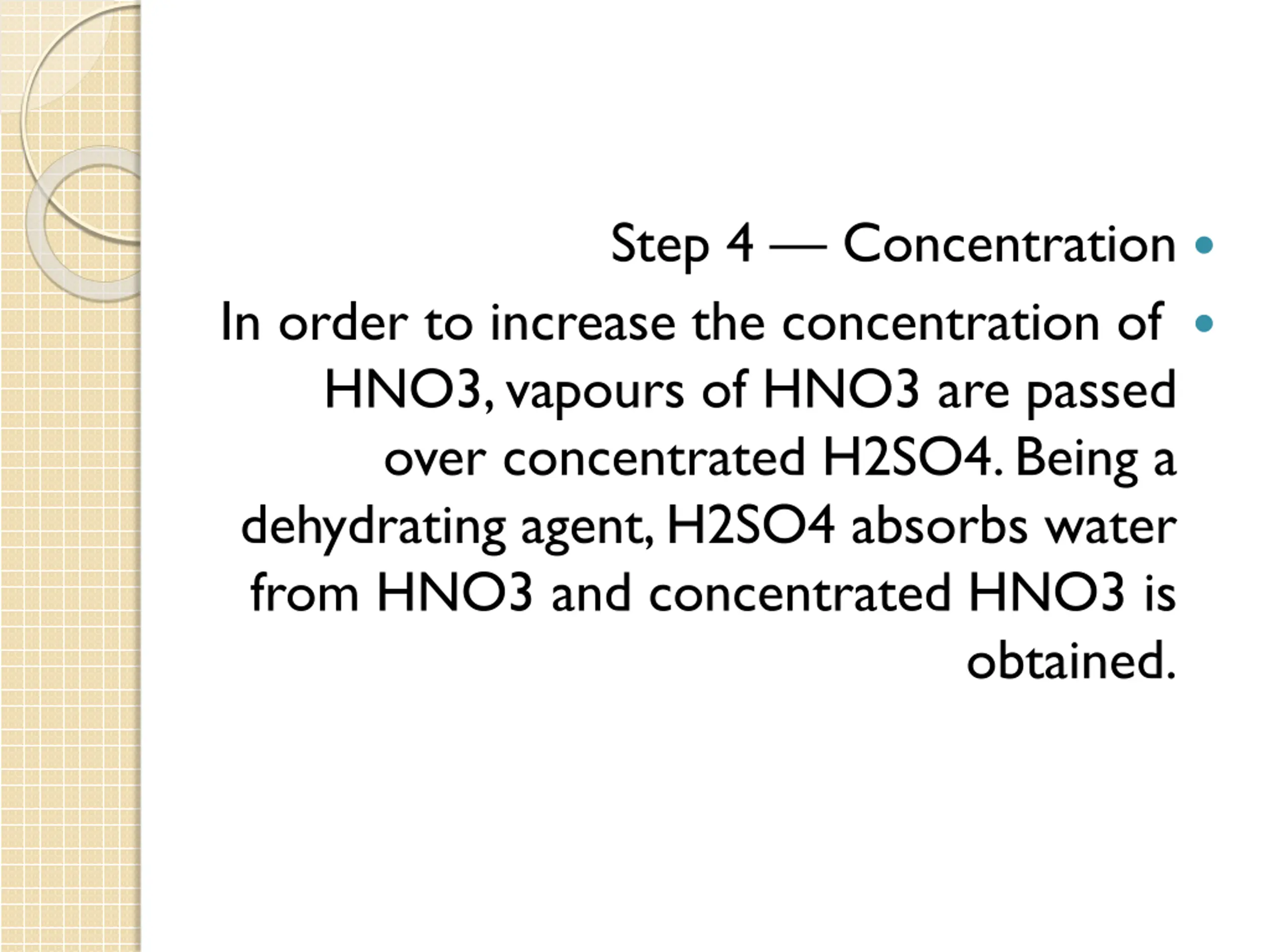 Step 4 Concentration In order to increase the concentration of HNO3, vapours of HNO3 are passed over concentrated H2SO4. Being a dehydrating agent, H2SO4 absorbs water from HNO3 and concentrated HNO3 is obtained.