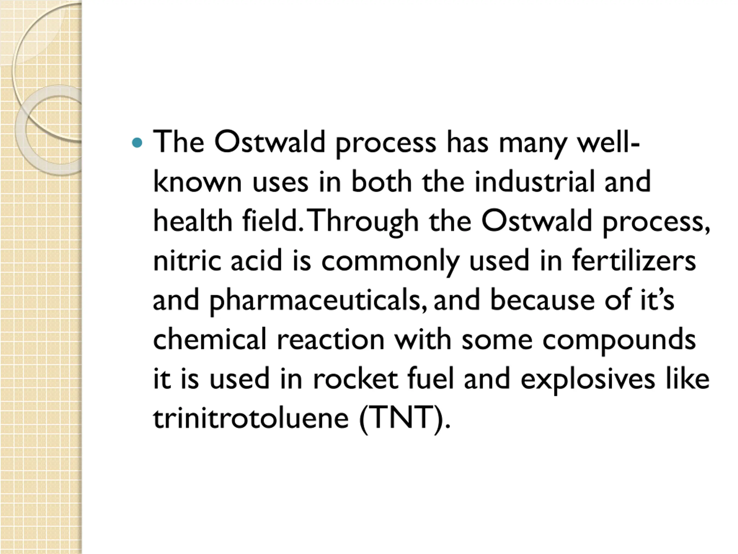 The Ostwald process has many well- known uses in both the industrial and health field. Through the Ostwald process, nitric acid is commonly used in fertilizers and pharmaceuticals, and because of it s chemical reaction with some compounds it is used in rocket fuel and explosives like trinitrotoluene (TNT).