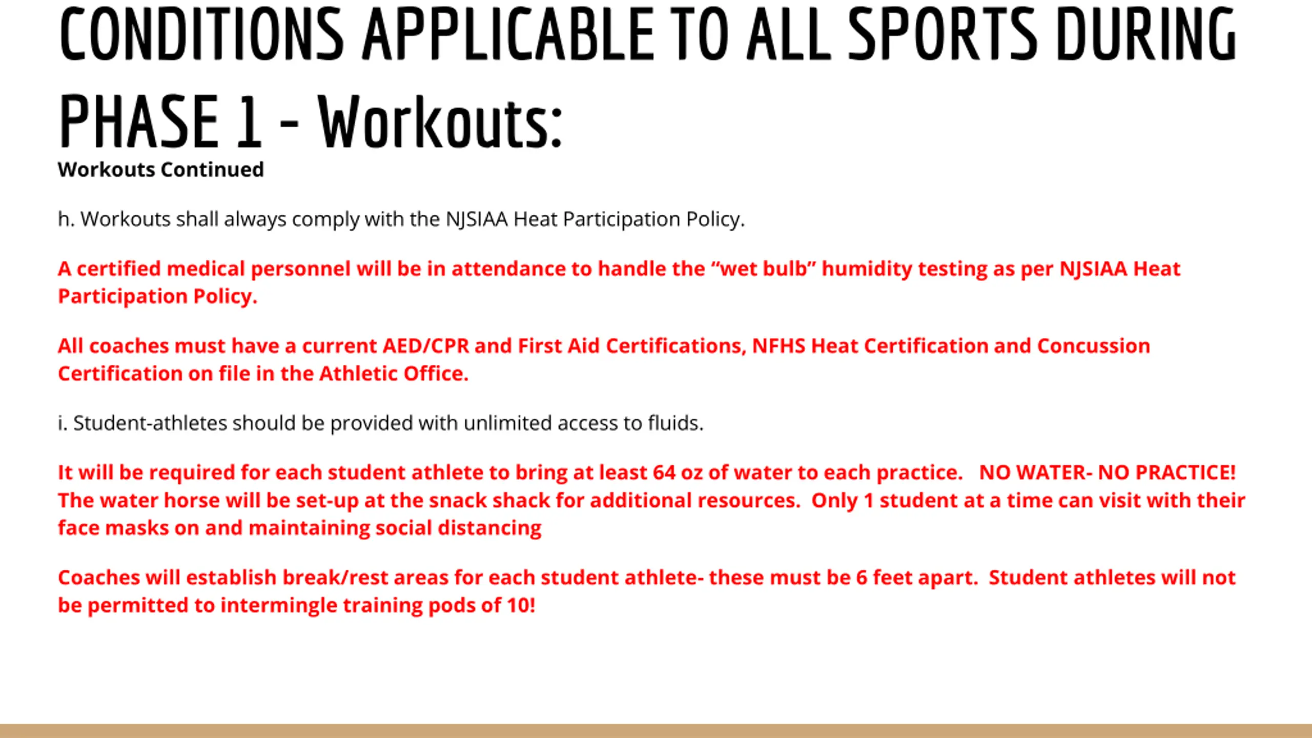 CONDITIONS APPLICABLE TO ALL SPORTS DURING PHASE 1 -Workouts: Workouts Continued h. Workouts shall always comply with the NJSIAA Heat Participation Policy. A certified medical personnel will be in attendance to handle the wet bulb humidity testing as per NJSIAA Heat Participation Policy. All coaches must have a current AED/CPR and First Aid Certifications, NFHS Heat Certification and Concussion Certification on file in the Athletic Office. i. Student-athletes should be provided with unlimited access to fluids. It will be required for each student athlete to bring at least 64 oz of water to each practice. NO WATER- NO PRACTICE! The water horse will be set-up at the snack shack for additional resources. Only 1 student at a time can visit with their face masks on and maintaining social distancing Coaches will establish break/rest areas for each student athlete- these must be 6 feet apart. Student athletes will not be permitted to intermingle training pods of 10!