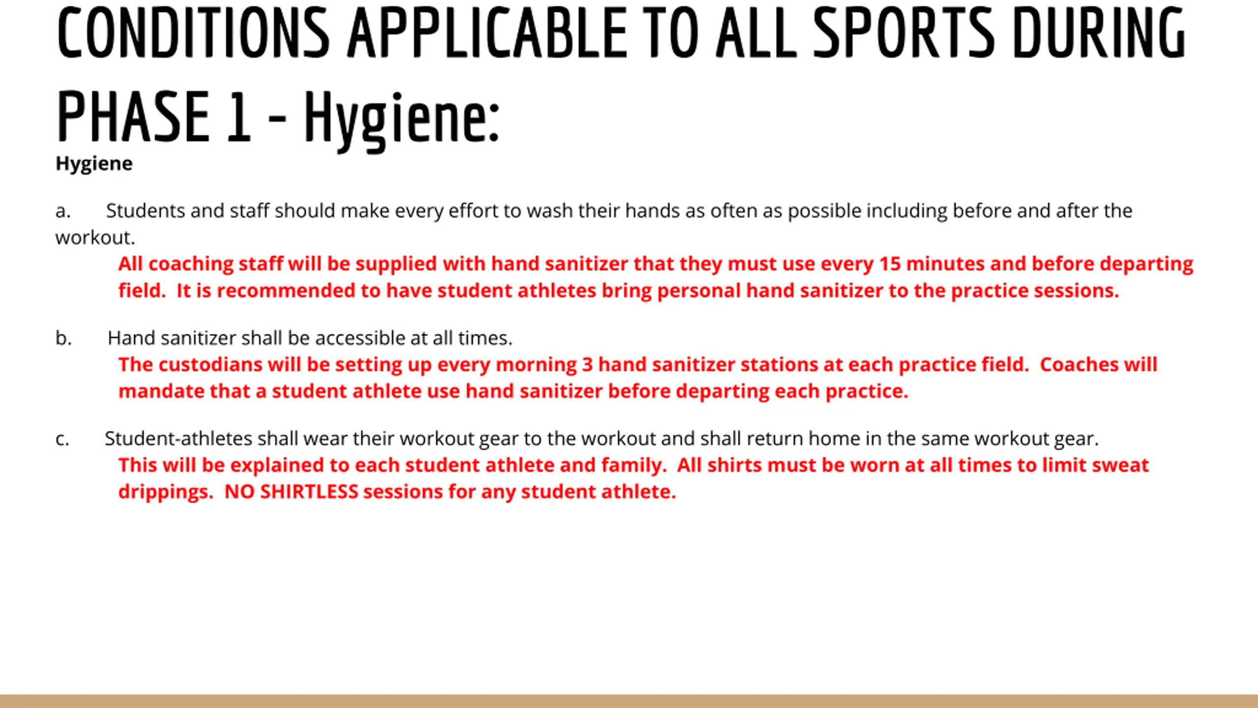 CONDITIONS APPLICABLE TO ALL SPORTS DURING PHASE 1 -Hygiene: Hygiene a. Students and staff should make every effort to wash their hands as often as possible including before and after the workout. All coaching staff will be supplied with hand sanitizer that they must use every 15 minutes and before departing field. It is recommended to have student athletes bring personal hand sanitizer to the practice sessions. b. Hand sanitizer shall be accessible at all times. The custodians will be setting up every morning 3 hand sanitizer stations at each practice field. Coaches will mandate that a student athlete use hand sanitizer before departing each practice. c. Student-athletes shall wear their workout gear to the workout and shall return home in the same workout gear. This will be explained to each student athlete and family. All shirts must be worn at all times to limit sweat drippings. NO SHIRTLESS sessions for any student athlete.