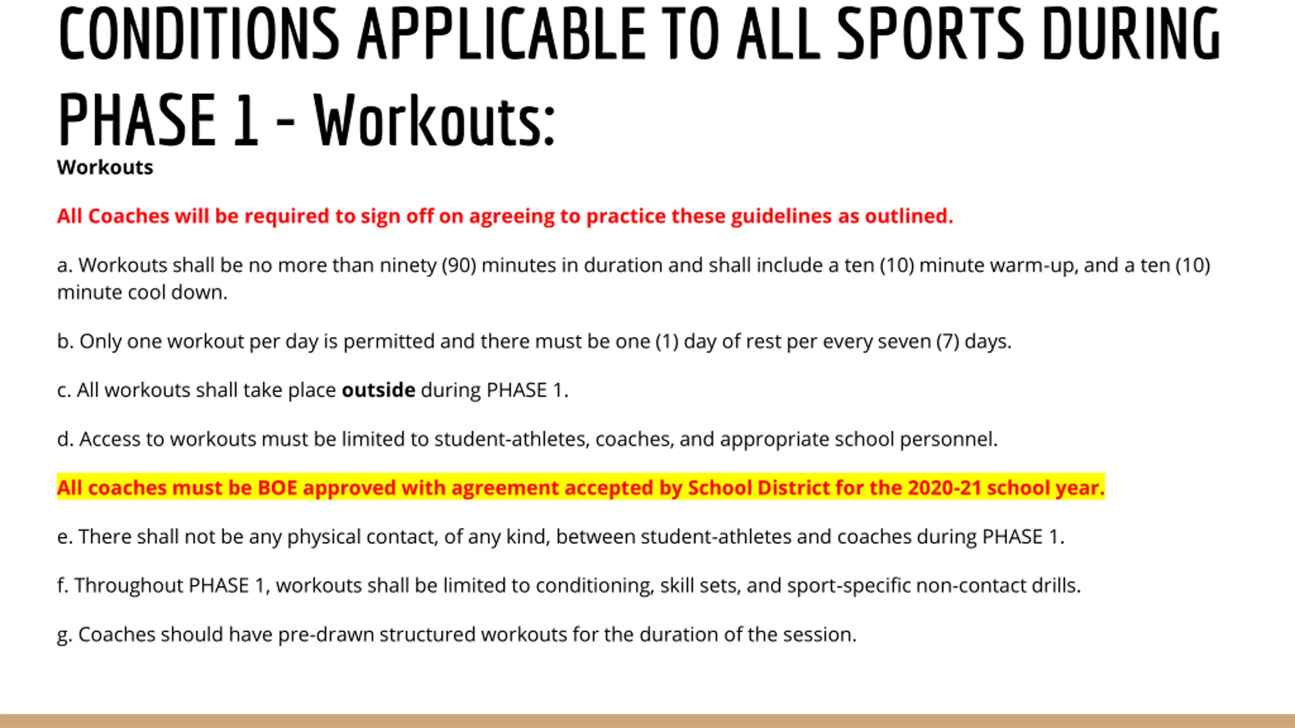 CONDITIONS APPLICABLE TO ALL SPORTS DURING PHASE 1 -Workouts: Workouts All Coaches will be required to sign off on agreeing to practice these guidelines as outlined. a. Workouts shall be no more than ninety (90) minutes in duration and shall include a ten (10) minute warm-up, and a ten (10) minute cool down. b. Only one workout per day is permitted and there must be one (1) day of rest per every seven (7) days. c. All workouts shall take place outside during PHASE 1. d. Access to workouts must be limited to student-athletes, coaches, and appropriate school personnel. All coaches must be BOE approved with agreement accepted by School District for the 2020-21 school year. e. There shall not be any physical contact, of any kind, between student-athletes and coaches during PHASE 1. f. Throughout PHASE 1, workouts shall be limited to conditioning, skill sets, and sport-specific non-contact drills. g. Coaches should have pre-drawn structured workouts for the duration of the session.