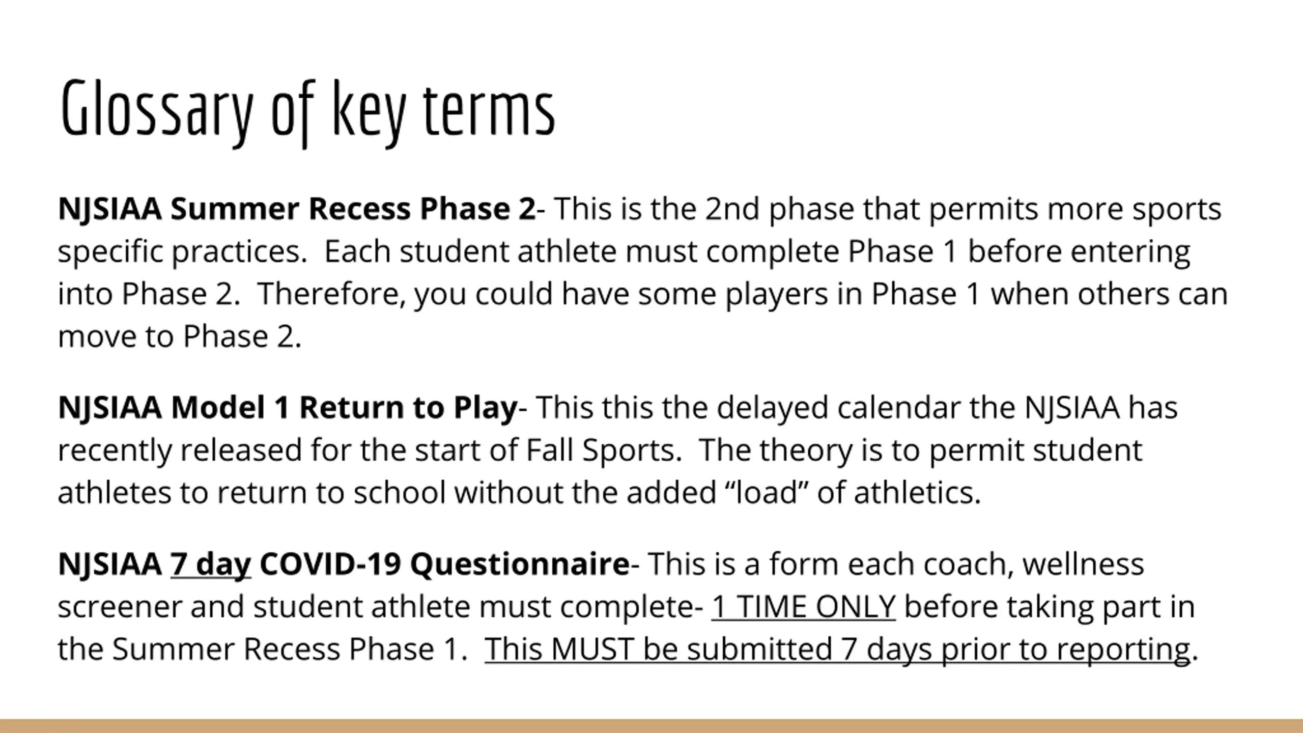 Glossary of key terms NJSIAA Summer Recess Phase 2- This is the 2nd phase that permits more sports specific practices. Each student athlete must complete Phase 1 before entering into Phase 2. Therefore, you could have some players in Phase 1 when others can move to Phase 2. NJSIAA Model 1 Return to Play- This this the delayed calendar the NJSIAA has recently released for the start of Fall Sports. The theory is to permit student athletes to return to school without the added load of athletics. NJSIAA 7 day COVID-19 Questionnaire- This is a form each coach, wellness screener and student athlete must complete- 1 TIME ONLY before taking part in the Summer Recess Phase 1. This MUST be submitted 7 days prior to reporting.