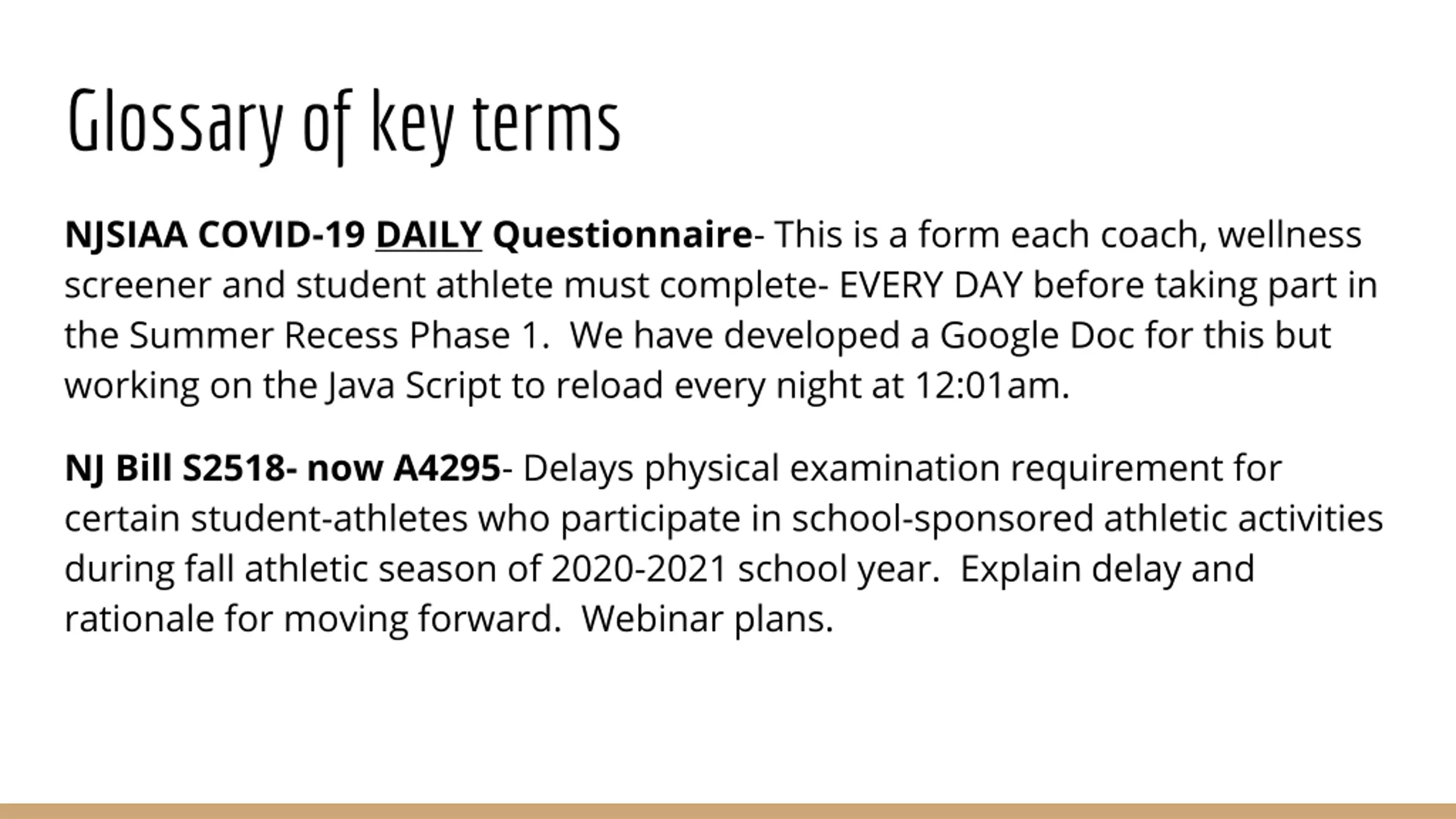 Glossary of key terms NJSIAA COVID-19 DAILY Questionnaire- This is a form each coach, wellness screener and student athlete must complete- EVERY DAY before taking part in the Summer Recess Phase 1. We have developed a Google Doc for this but working on the Java Script to reload every night at 12:01am. NJ Bill S2518- now A4295- Delays physical examination requirement for certain student-athletes who participate in school-sponsored athletic activities during fall athletic season of 2020-2021 school year. Explain delay and rationale for moving forward. Webinar plans.