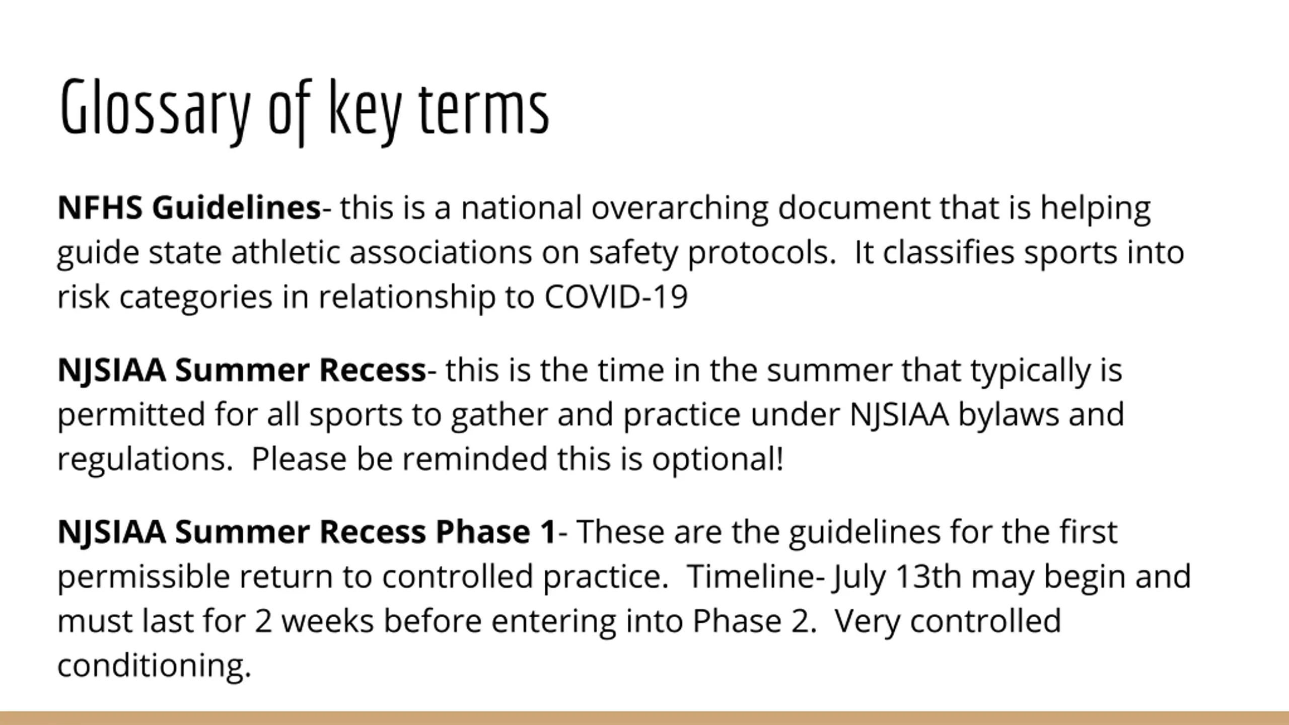 Glossary of key terms NFHS Guidelines- this is a national overarching document that is helping guide state athletic associations on safety protocols. It classifies sports into risk categories in relationship to COVID-19 NJSIAA Summer Recess- this is the time in the summer that typically is permitted for all sports to gather and practice under NJSIAA bylaws and regulations. Please be reminded this is optional! NJSIAA Summer Recess Phase 1- These are the guidelines for the first permissible return to controlled practice. Timeline- July 13th may begin and must last for 2 weeks before entering into Phase 2. Very controlled conditioning.