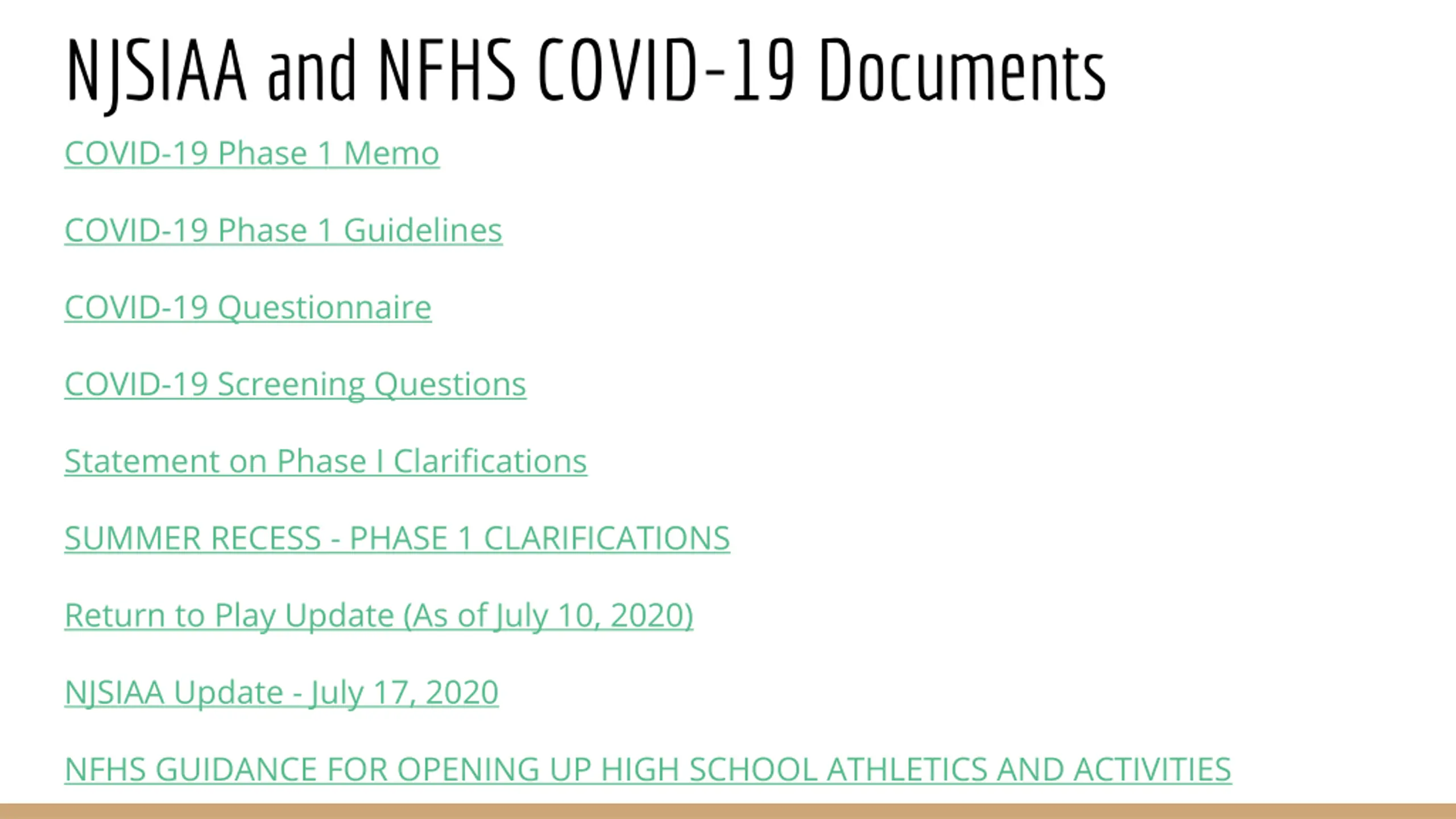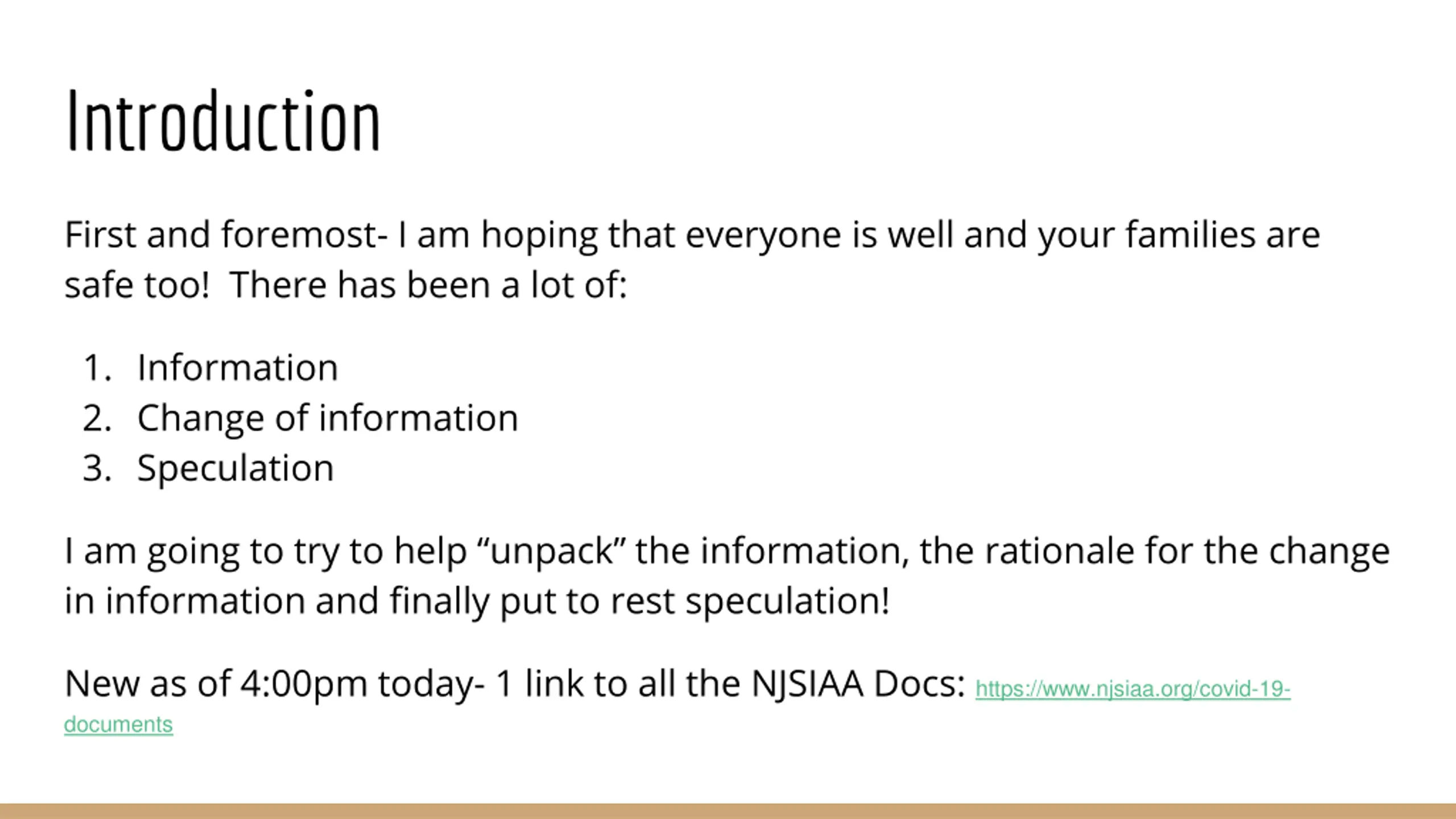 Introduction First and foremost- I am hoping that everyone is well and your families are safe too! There has been a lot of: 1. Information 2. Change of information 3. Speculation I am going to try to help unpack the information, the rationale for the change in information and finally put to rest speculation! New as of 4:00pm today- 1 link to all the NJSIAA Docs: https://www.njsiaa.org/covid-19- documents