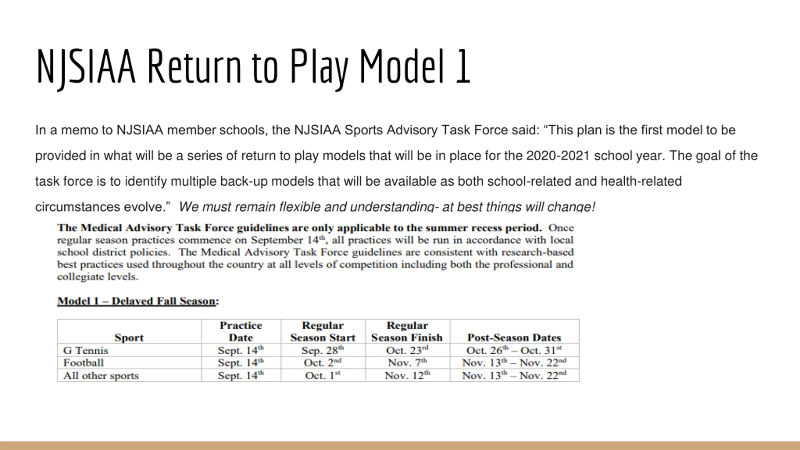NJSIAA Return to Play Model 1 In a memo to NJSIAA member schools, the NJSIAA Sports Advisory Task Force said: This plan is the first model to be provided in what will be a series of return to play models that will be in place for the 2020-2021 school year. The goal of the task force is to identify multiple back-up models that will be available as both school-related and health-related circumstances evolve. We must remain flexible and understanding- at best things will change!