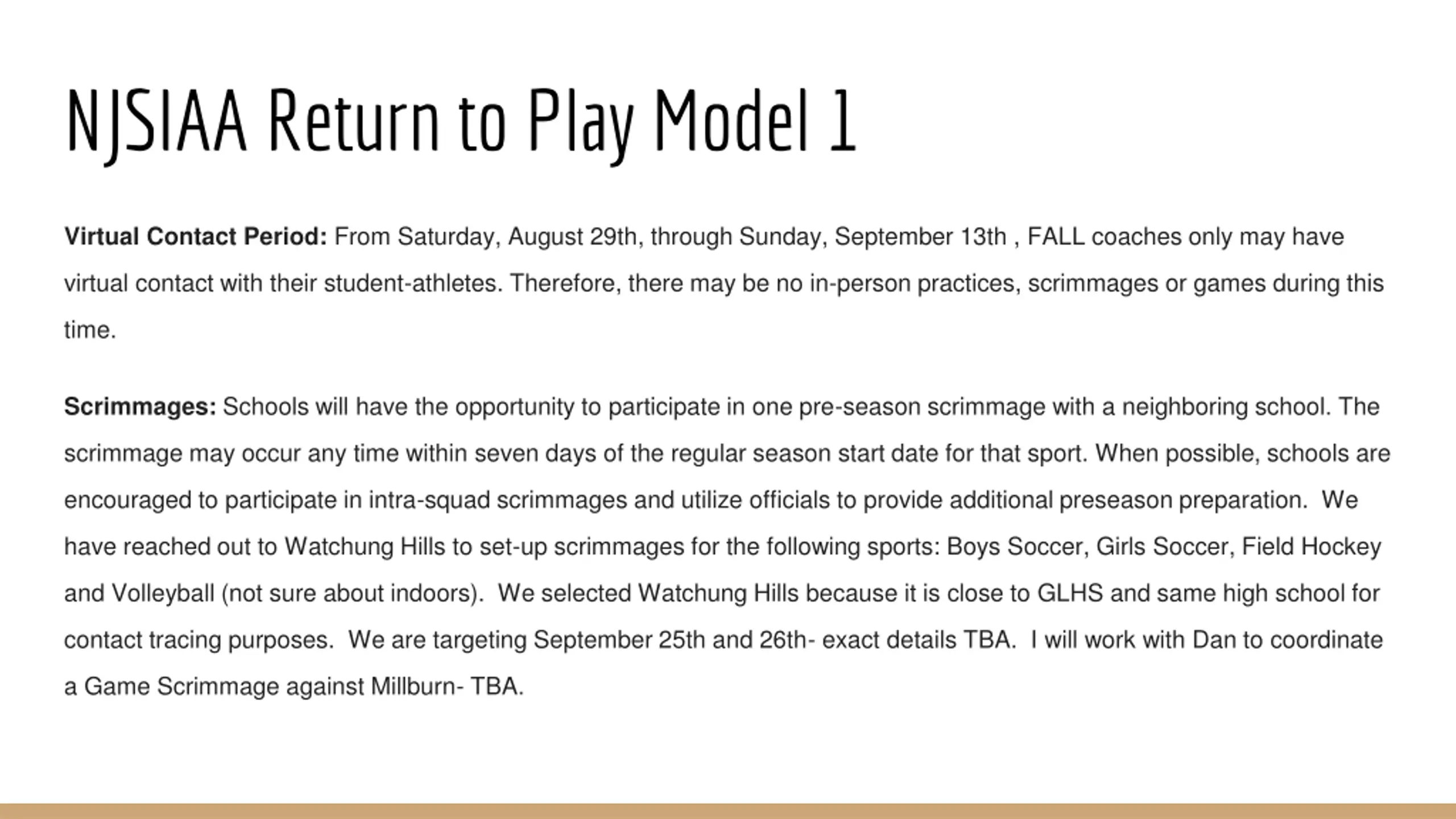 NJSIAA Return to Play Model 1 Virtual Contact Period: From Saturday, August 29th, through Sunday, September 13th , FALL coaches only may have virtual contact with their student-athletes. Therefore, there may be no in-person practices, scrimmages or games during this time. Scrimmages: Schools will have the opportunity to participate in one pre-season scrimmage with a neighboring school. The scrimmage may occur any time within seven days of the regular season start date for that sport. When possible, schools are encouraged to participate in intra-squad scrimmages and utilize officials to provide additional preseason preparation. We have reached out to Watchung Hills to set-up scrimmages for the following sports: Boys Soccer, Girls Soccer, Field Hockey and Volleyball (not sure about indoors). We selected Watchung Hills because it is close to GLHS and same high school for contact tracing purposes. We are targeting September 25th and 26th- exact details TBA. I will work with Dan to coordinate a Game Scrimmage against Millburn- TBA.