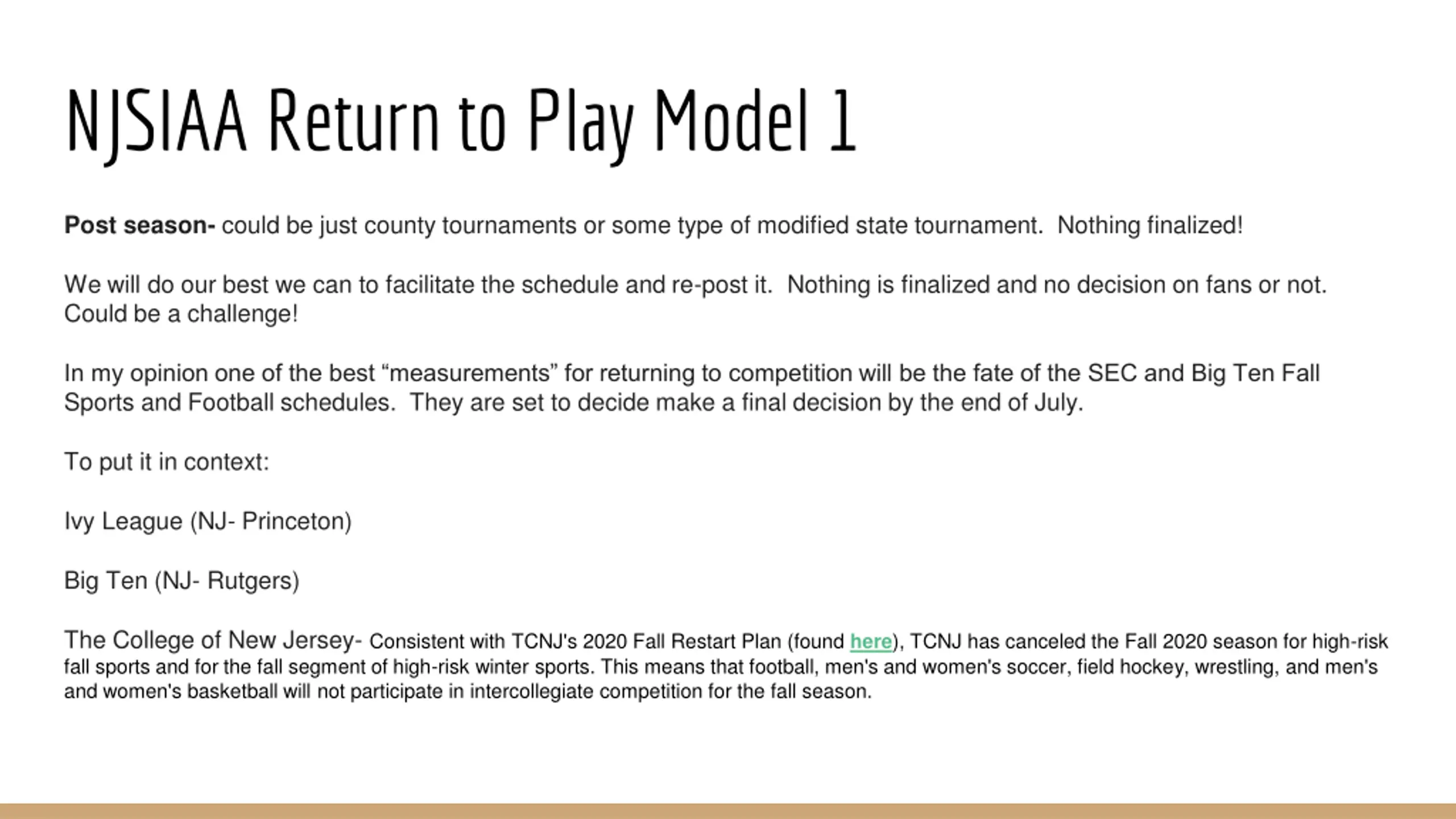NJSIAA Return to Play Model 1 Post season- could be just county tournaments or some type of modified state tournament. Nothing finalized! We will do our best we can to facilitate the schedule and re-post it. Nothing is finalized and no decision on fans or not. Could be a challenge! In my opinion one of the best measurements for returning to competition will be the fate of the SEC and Big Ten Fall Sports and Football schedules. They are set to decide make a final decision by the end of July. To put it in context: Ivy League (NJ- Princeton) Big Ten (NJ- Rutgers) The College of New Jersey- Consistent with TCNJ's 2020 Fall Restart Plan (found here), TCNJ has canceled the Fall 2020 season for high-risk fall sports and for the fall segment of high-risk winter sports. This means that football, men's and women's soccer, field hockey, wrestling, and men's and women's basketball will not participate in intercollegiate competition for the fall season.