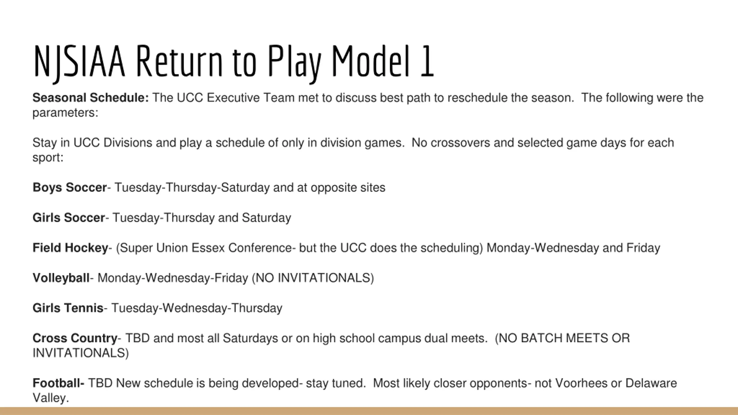 NJSIAA Return to Play Model 1 Seasonal Schedule: The UCC Executive Team met to discuss best path to reschedule the season. The following were the parameters: Stay in UCC Divisions and play a schedule of only in division games. No crossovers and selected game days for each sport: Boys Soccer- Tuesday-Thursday-Saturday and at opposite sites Girls Soccer- Tuesday-Thursday and Saturday Field Hockey- (Super Union Essex Conference- but the UCC does the scheduling) Monday-Wednesday and Friday Volleyball- Monday-Wednesday-Friday (NO INVITATIONALS) Girls Tennis- Tuesday-Wednesday-Thursday Cross Country- TBD and most all Saturdays or on high school campus dual meets. (NO BATCH MEETS OR INVITATIONALS) Football- TBD New schedule is being developed- stay tuned. Most likely closer opponents- not Voorhees or Delaware Valley.