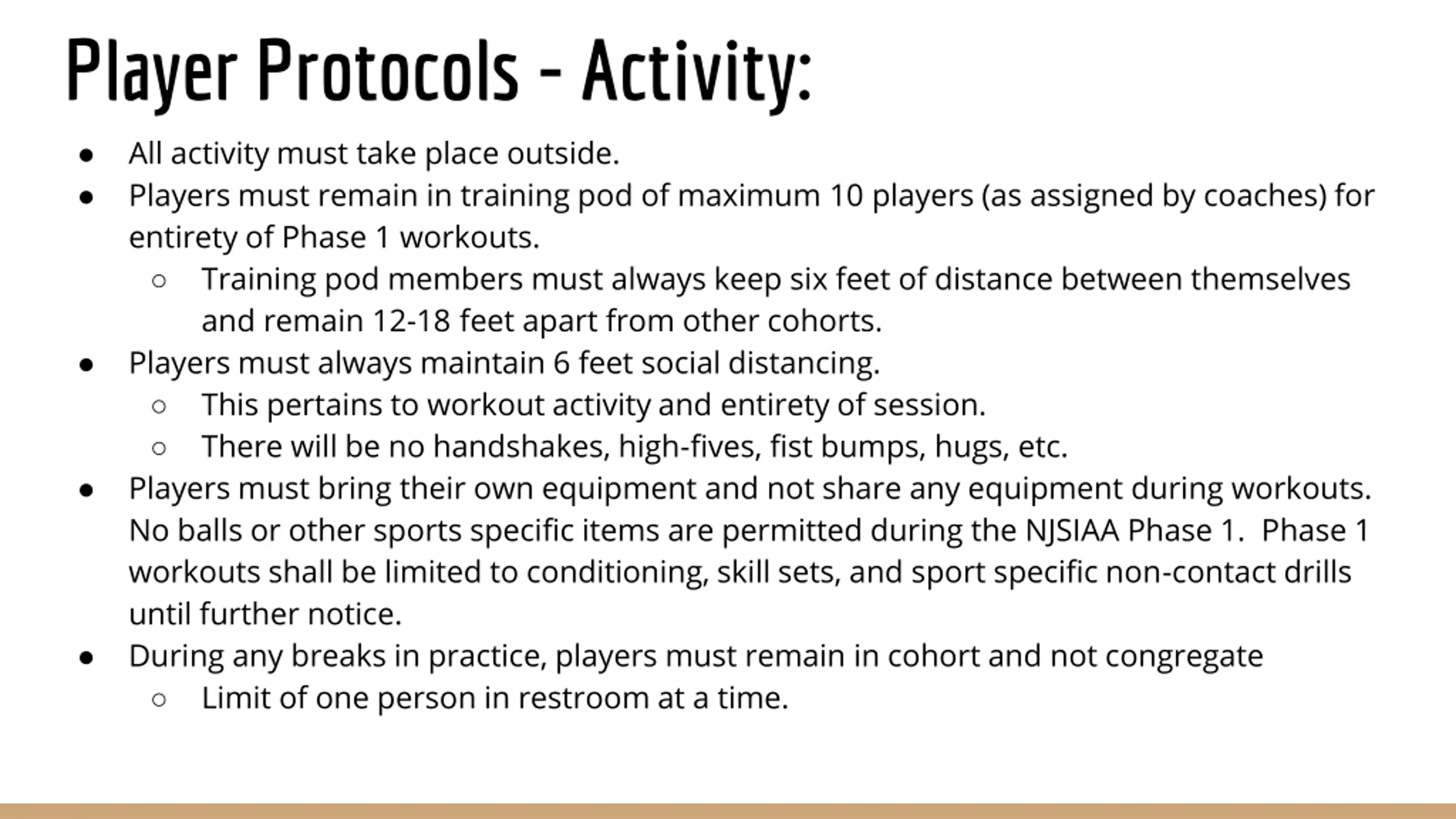 Player Protocols -Activity: All activity must take place outside. Players must remain in training pod of maximum 10 players (as assigned by coaches) for entirety of Phase 1 workouts. Training pod members must always keep six feet of distance between themselves and remain 12-18 feet apart from other cohorts. Players must always maintain 6 feet social distancing. This pertains to workout activity and entirety of session. There will be no handshakes, high-fives, fist bumps, hugs, etc. Players must bring their own equipment and not share any equipment during workouts. No balls or other sports specific items are permitted during the NJSIAA Phase 1. Phase 1 workouts shall be limited to conditioning, skill sets, and sport specific non-contact drills until further notice. During any breaks in practice, players must remain in cohort and not congregate Limit of one person in restroom at a time.