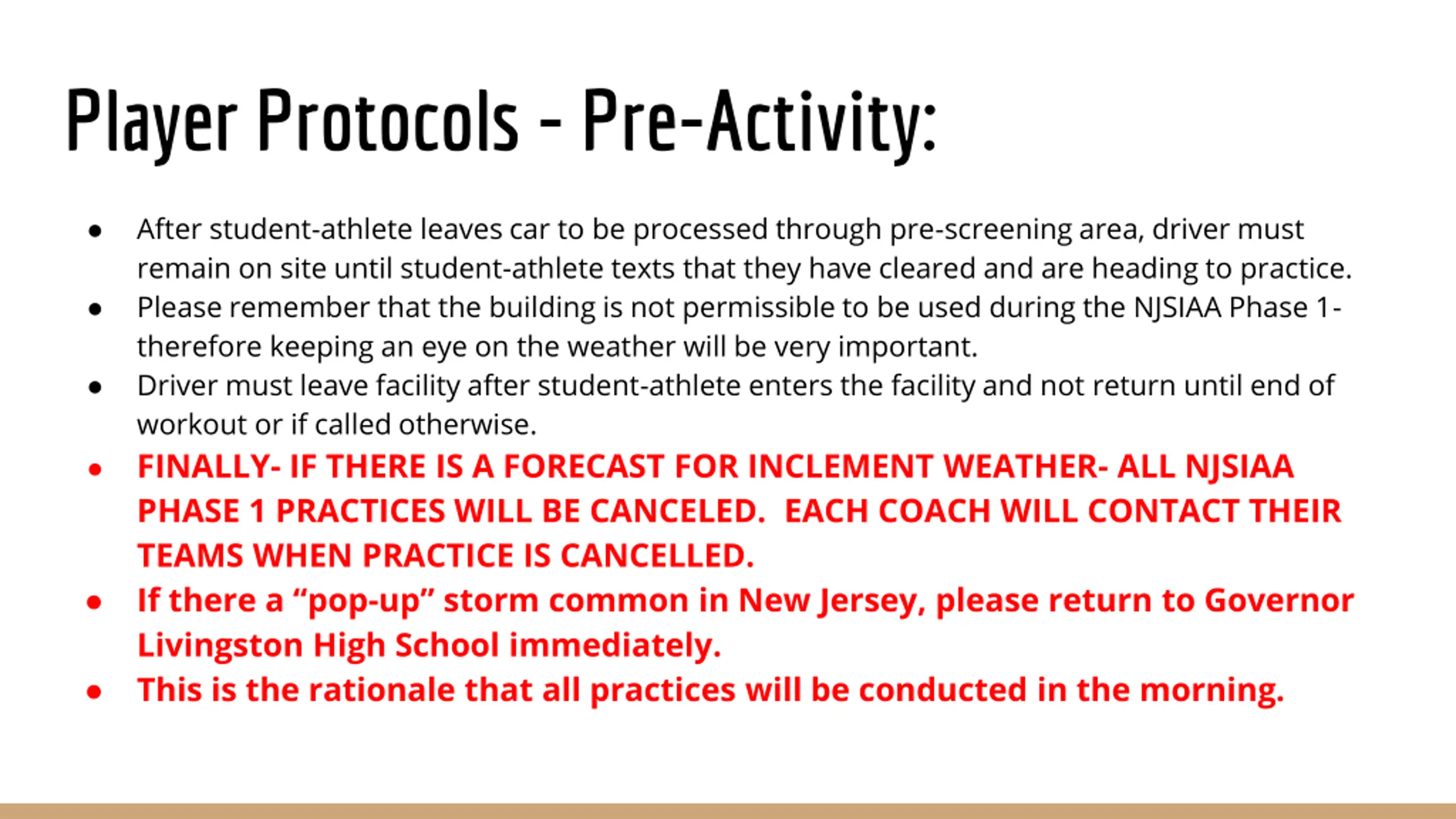 Player Protocols -Pre-Activity: After student-athlete leaves car to be processed through pre-screening area, driver must remain on site until student-athlete texts that they have cleared and are heading to practice. Please remember that the building is not permissible to be used during the NJSIAA Phase 1- therefore keeping an eye on the weather will be very important. Driver must leave facility after student-athlete enters the facility and not return until end of workout or if called otherwise. FINALLY- IF THERE IS A FORECAST FOR INCLEMENT WEATHER- ALL NJSIAA PHASE 1 PRACTICES WILL BE CANCELED. EACH COACH WILL CONTACT THEIR TEAMS WHEN PRACTICE IS CANCELLED. If there a pop-up storm common in New Jersey, please return to Governor Livingston High School immediately. This is the rationale that all practices will be conducted in the morning.