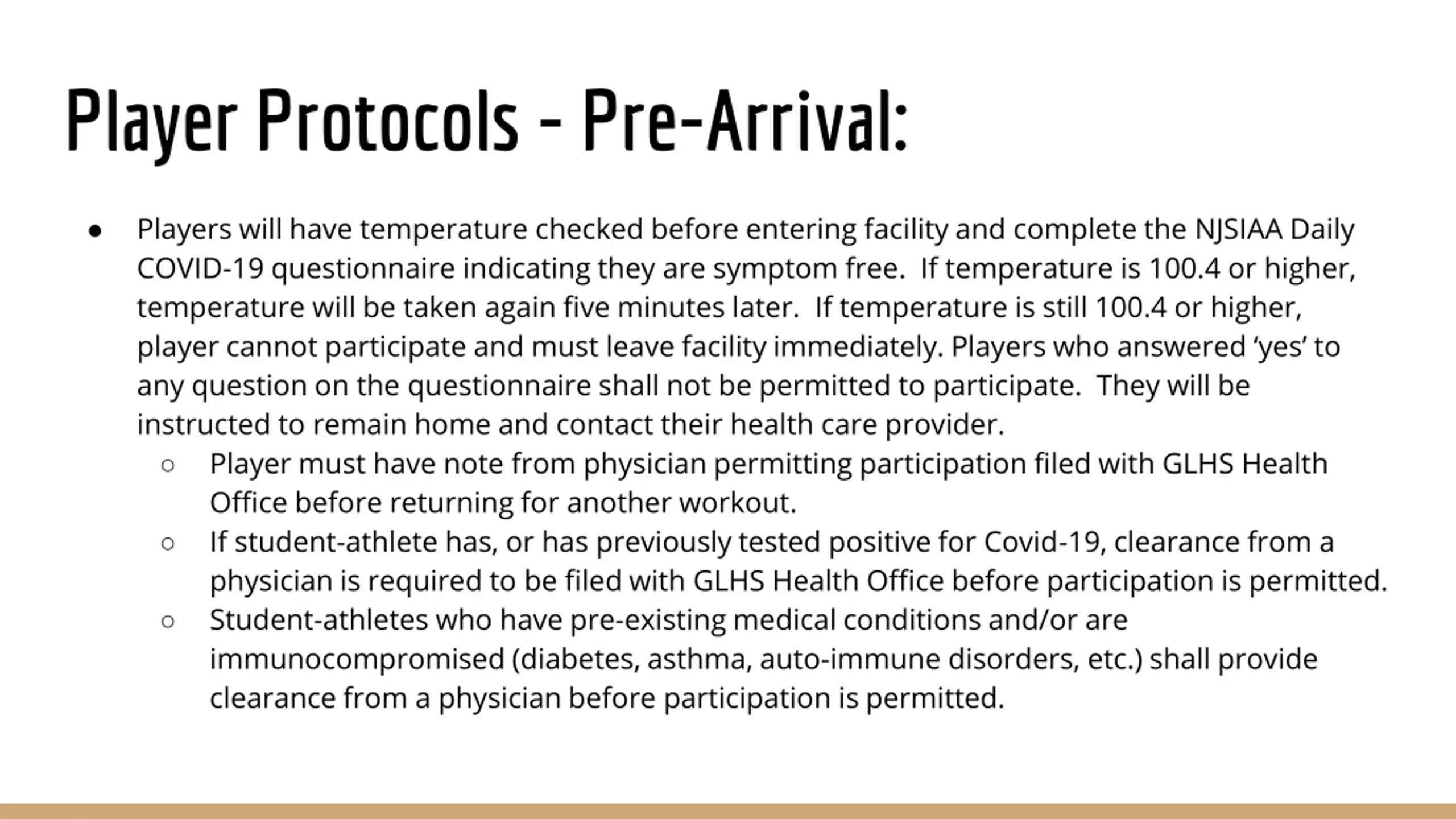 Player Protocols -Pre-Arrival: Players will have temperature checked before entering facility and complete the NJSIAA Daily COVID-19 questionnaire indicating they are symptom free. If temperature is 100.4 or higher, temperature will be taken again five minutes later. If temperature is still 100.4 or higher, player cannot participate and must leave facility immediately. Players who answered yes to any question on the questionnaire shall not be permitted to participate. They will be instructed to remain home and contact their health care provider. Player must have note from physician permitting participation filed with GLHS Health Office before returning for another workout. If student-athlete has, or has previously tested positive for Covid-19, clearance from a physician is required to be filed with GLHS Health Office before participation is permitted. Student-athletes who have pre-existing medical conditions and/or are immunocompromised (diabetes, asthma, auto-immune disorders, etc.) shall provide clearance from a physician before participation is permitted.