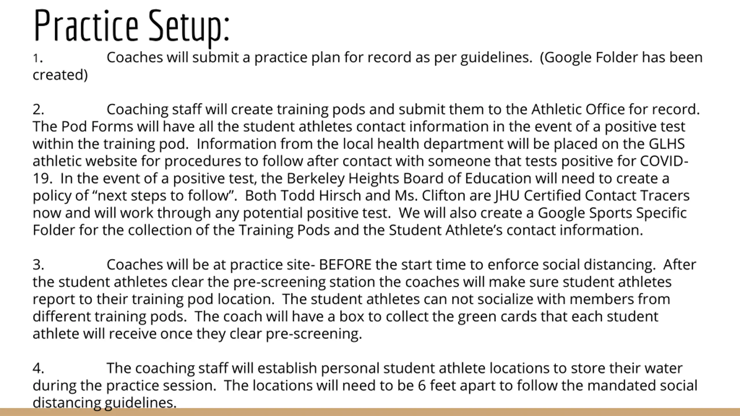Practice Setup: 1. Coaches will submit a practice plan for record as per guidelines. (Google Folder has been created) 2. The Pod Forms will have all the student athletes contact information in the event of a positive test within the training pod. Information from the local health department will be placed on the GLHS athletic website for procedures to follow after contact with someone that tests positive for COVID- 19. In the event of a positive test, the Berkeley Heights Board of Education will need to create a policy of next steps to follow . Both Todd Hirsch and Ms. Clifton are JHU Certified Contact Tracers now and will work through any potential positive test. We will also create a Google Sports Specific Folder for the collection of the Training Pods and the Student Athlete s contact information. Coaching staff will create training pods and submit them to the Athletic Office for record. 3. the student athletes clear the pre-screening station the coaches will make sure student athletes report to their training pod location. The student athletes can not socialize with members from different training pods. The coach will have a box to collect the green cards that each student athlete will receive once they clear pre-screening. Coaches will be at practice site- BEFORE the start time to enforce social distancing. After 4. during the practice session. The locations will need to be 6 feet apart to follow the mandated social distancing guidelines. The coaching staff will establish personal student athlete locations to store their water