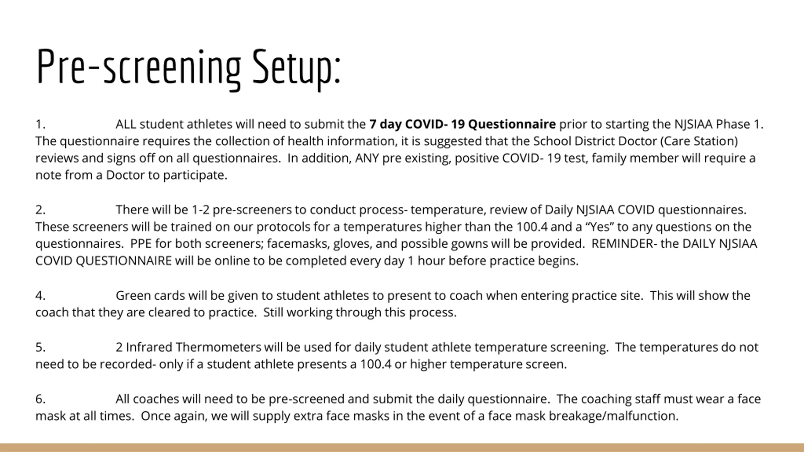 Pre-screening Setup: 1. The questionnaire requires the collection of health information, it is suggested that the School District Doctor (Care Station) reviews and signs off on all questionnaires. In addition, ANY pre existing, positive COVID- 19 test, family member will require a note from a Doctor to participate. ALL student athletes will need to submit the 7 day COVID- 19 Questionnaire prior to starting the NJSIAA Phase 1. 2. These screeners will be trained on our protocols for a temperatures higher than the 100.4 and a Yes to any questions on the questionnaires. PPE for both screeners; facemasks, gloves, and possible gowns will be provided. REMINDER- the DAILY NJSIAA COVID QUESTIONNAIRE will be online to be completed every day 1 hour before practice begins. There will be 1-2 pre-screeners to conduct process- temperature, review of Daily NJSIAA COVID questionnaires. 4. coach that they are cleared to practice. Still working through this process. Green cards will be given to student athletes to present to coach when entering practice site. This will show the 5. need to be recorded- only if a student athlete presents a 100.4 or higher temperature screen. 2 Infrared Thermometers will be used for daily student athlete temperature screening. The temperatures do not 6. mask at all times. Once again, we will supply extra face masks in the event of a face mask breakage/malfunction. All coaches will need to be pre-screened and submit the daily questionnaire. The coaching staff must wear a face