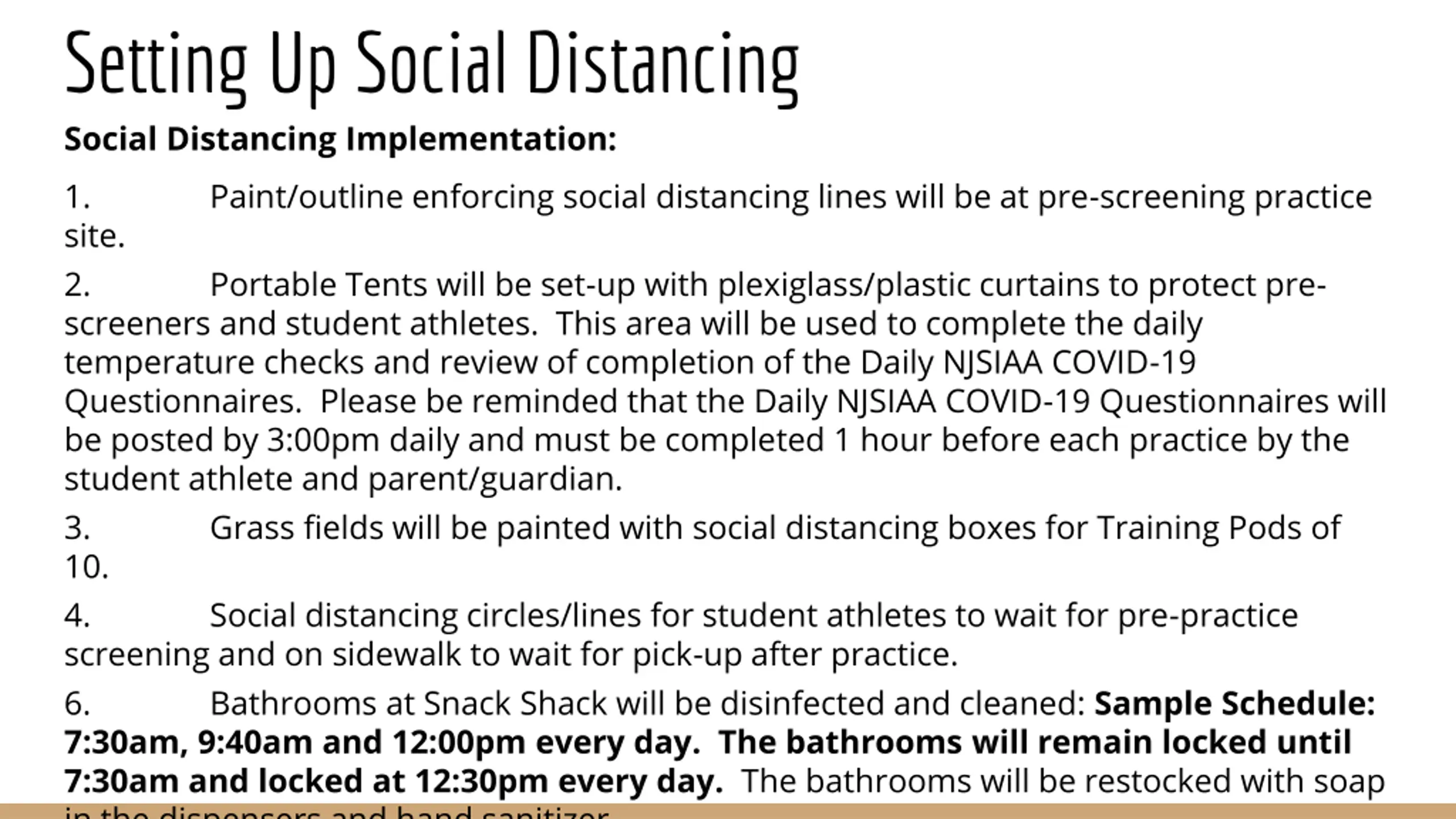 Setting Up Social Distancing Social Distancing Implementation: 1. Paint/outline enforcing social distancing lines will be at pre-screening practice site. 2. Portable Tents will be set-up with plexiglass/plastic curtains to protect pre- screeners and student athletes. This area will be used to complete the daily temperature checks and review of completion of the Daily NJSIAA COVID-19 Questionnaires. Please be reminded that the Daily NJSIAA COVID-19 Questionnaires will be posted by 3:00pm daily and must be completed 1 hour before each practice by the student athlete and parent/guardian. 3. Grass fields will be painted with social distancing boxes for Training Pods of 10. 4. Social distancing circles/lines for student athletes to wait for pre-practice screening and on sidewalk to wait for pick-up after practice. 6. Bathrooms at Snack Shack will be disinfected and cleaned: Sample Schedule: 7:30am, 9:40am and 12:00pm every day. The bathrooms will remain locked until 7:30am and locked at 12:30pm every day. The bathrooms will be restocked with soap in the dispensers and hand sanitizer.
