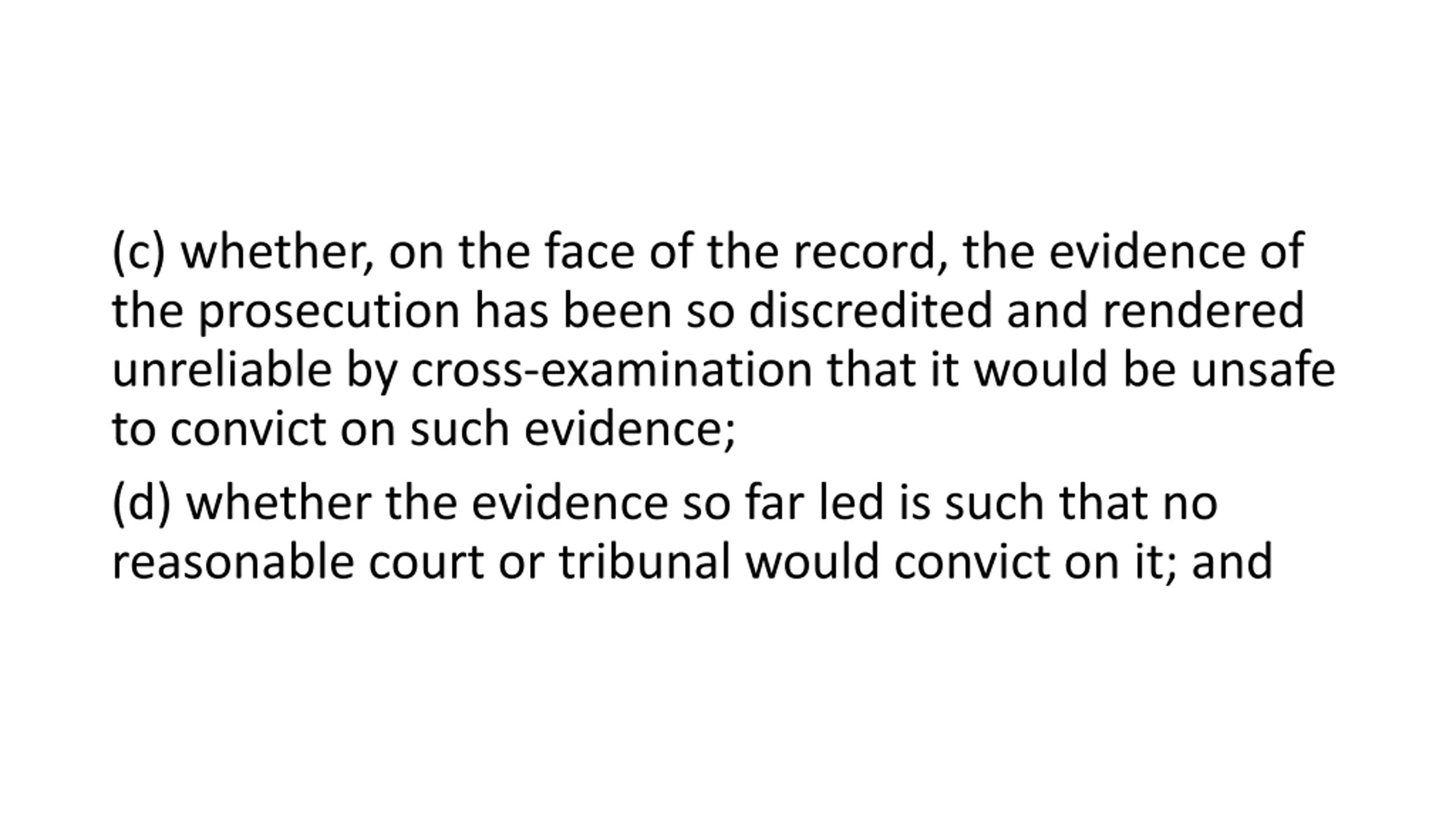 (c) whether, on the face of the record, the evidence of the prosecution has been so discredited and rendered unreliable by cross-examination that it would be unsafe to convict on such evidence; (d) whether the evidence so far led is such that no reasonable court or tribunal would convict on it; and