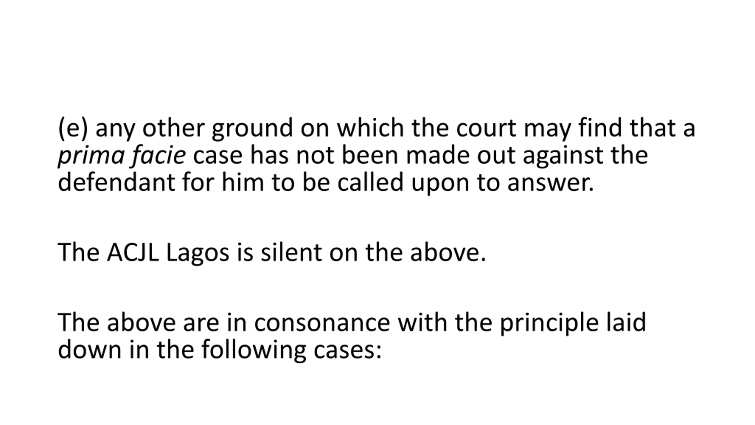 (e) any other ground on which the court may find that a prima facie case has not been made out against the defendant for him to be called upon to answer. The ACJL Lagos is silent on the above. The above are in consonance with the principle laid down in the following cases: