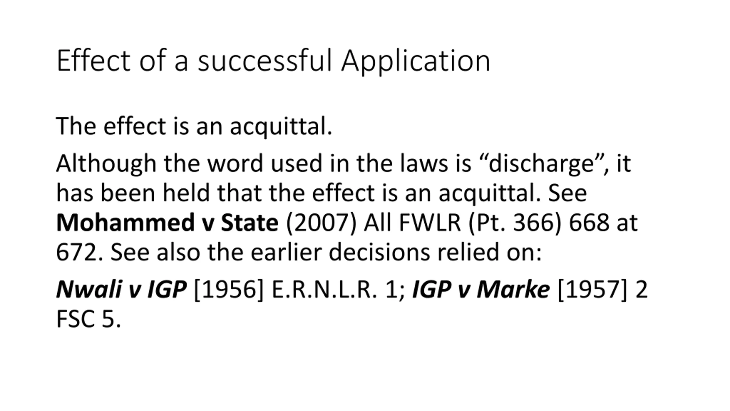 Effect of a successful Application The effect is an acquittal. Although the word used in the laws is discharge , it has been held that the effect is an acquittal. See Mohammed v State (2007) All FWLR (Pt. 366) 668 at 672. See also the earlier decisions relied on: Nwali v IGP [1956] E.R.N.L.R. 1; IGP v Marke [1957] 2 FSC 5.