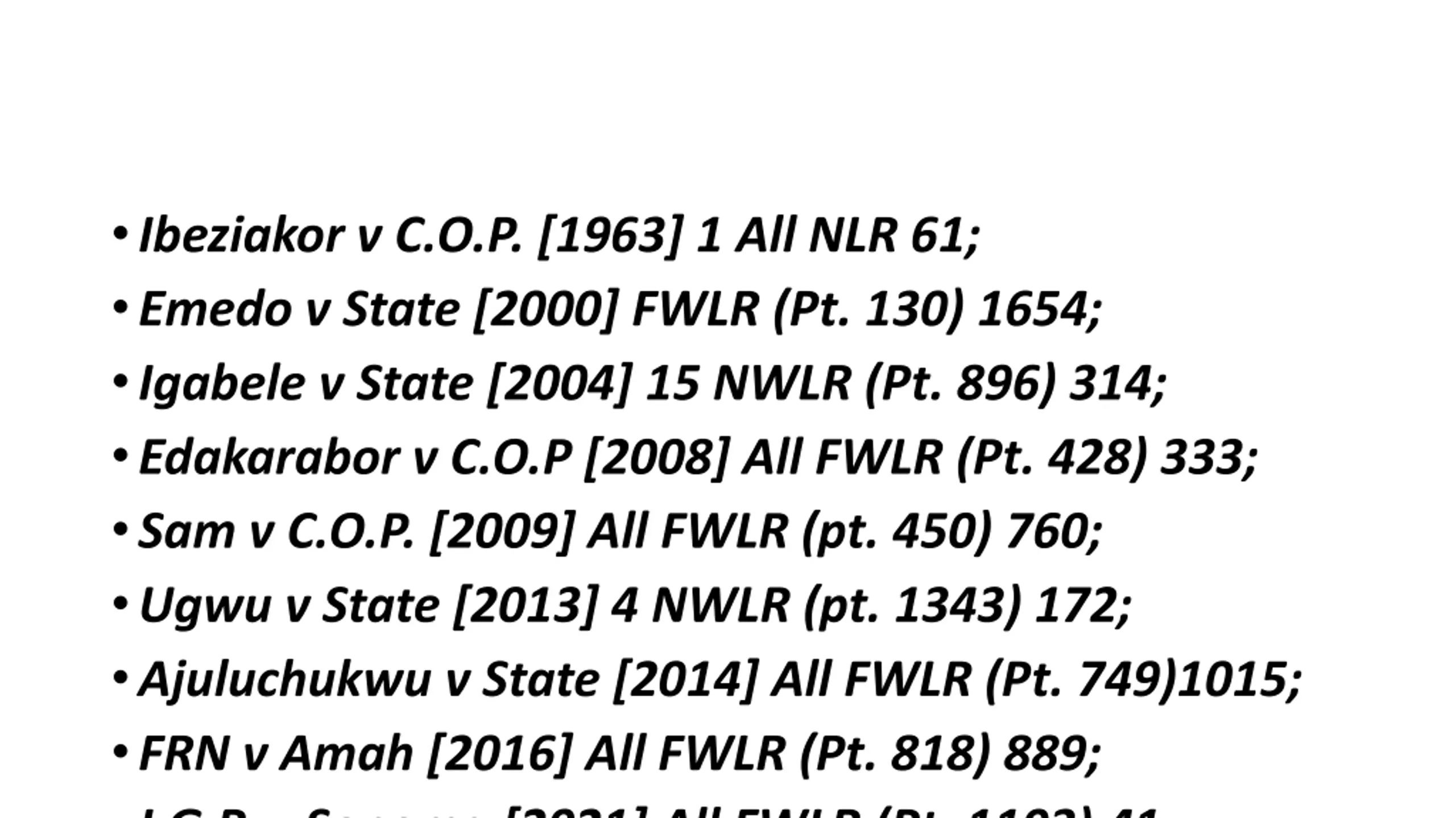 Ibeziakor v C.O.P. [1963] 1 All NLR 61; Emedo v State [2000] FWLR (Pt. 130) 1654; Igabele v State [2004] 15 NWLR (Pt. 896) 314; Edakarabor v C.O.P [2008] All FWLR (Pt. 428) 333; Sam v C.O.P. [2009] All FWLR (pt. 450) 760; Ugwu v State [2013] 4 NWLR (pt. 1343) 172; Ajuluchukwu v State [2014] All FWLR (Pt. 749)1015; FRN v Amah [2016] All FWLR (Pt. 818) 889; I.G.P. v Sonoma [2021] All FWLR (Pt. 1103) 41