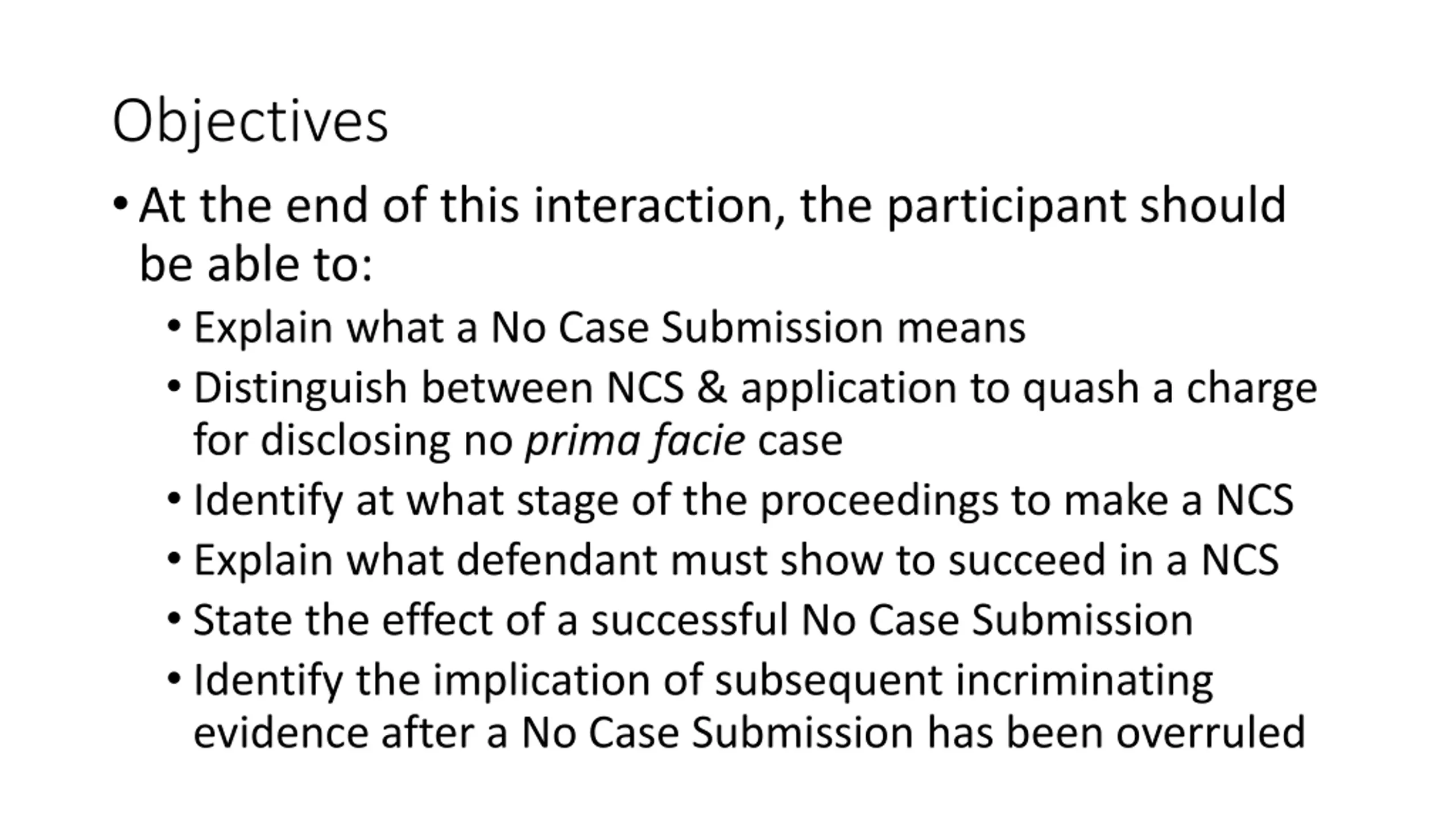 Objectives At the end of this interaction, the participant should be able to: Explain what a No Case Submission means Distinguish between NCS & application to quash a charge for disclosing no prima facie case Identify at what stage of the proceedings to make a NCS Explain what defendant must show to succeed in a NCS State the effect of a successful No Case Submission Identify the implication of subsequent incriminating evidence after a No Case Submission has been overruled
