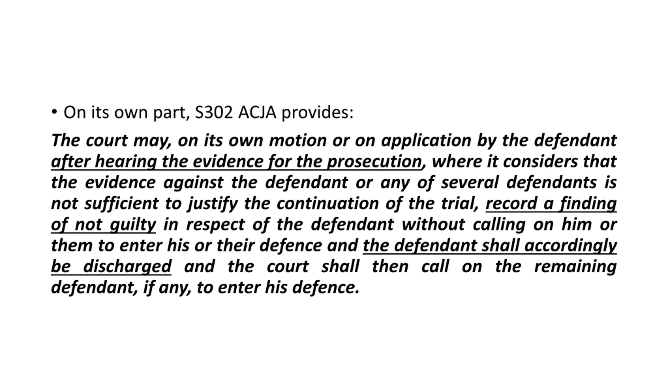 On its own part, S302 ACJA provides: The court may, on its own motion or on application by the defendant after hearing the evidence for the prosecution, where it considers that the evidence against the defendant or any of several defendants is not sufficient to justify the continuation of the trial, record a finding of not guilty in respect of the defendant without calling on him or them to enter his or their defence and the defendant shall accordingly be discharged and the court shall then call on the remaining defendant, if any, to enter his defence.