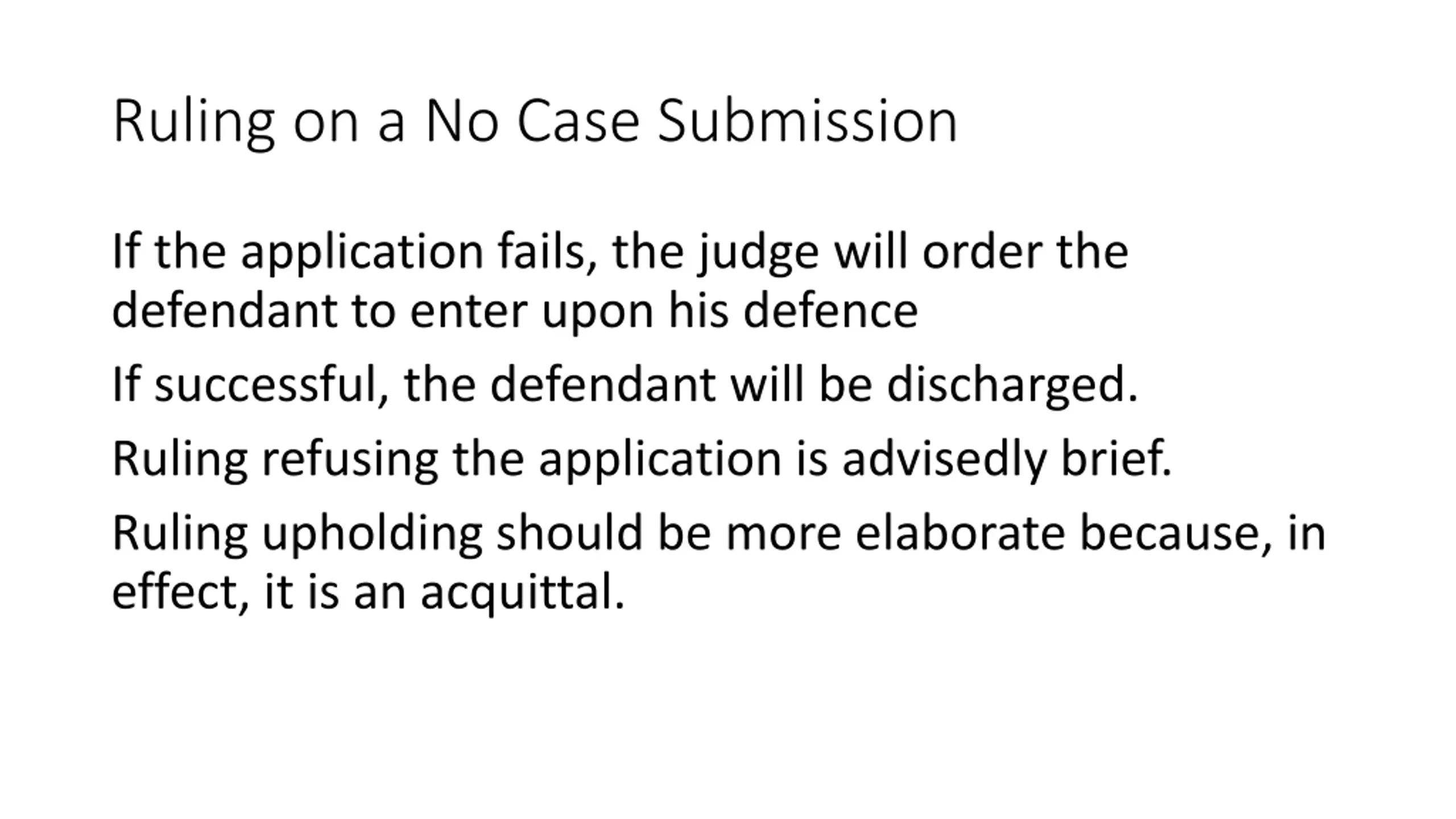 Ruling on a No Case Submission If the application fails, the judge will order the defendant to enter upon his defence If successful, the defendant will be discharged. Ruling refusing the application is advisedly brief. Ruling upholding should be more elaborate because, in effect, it is an acquittal.