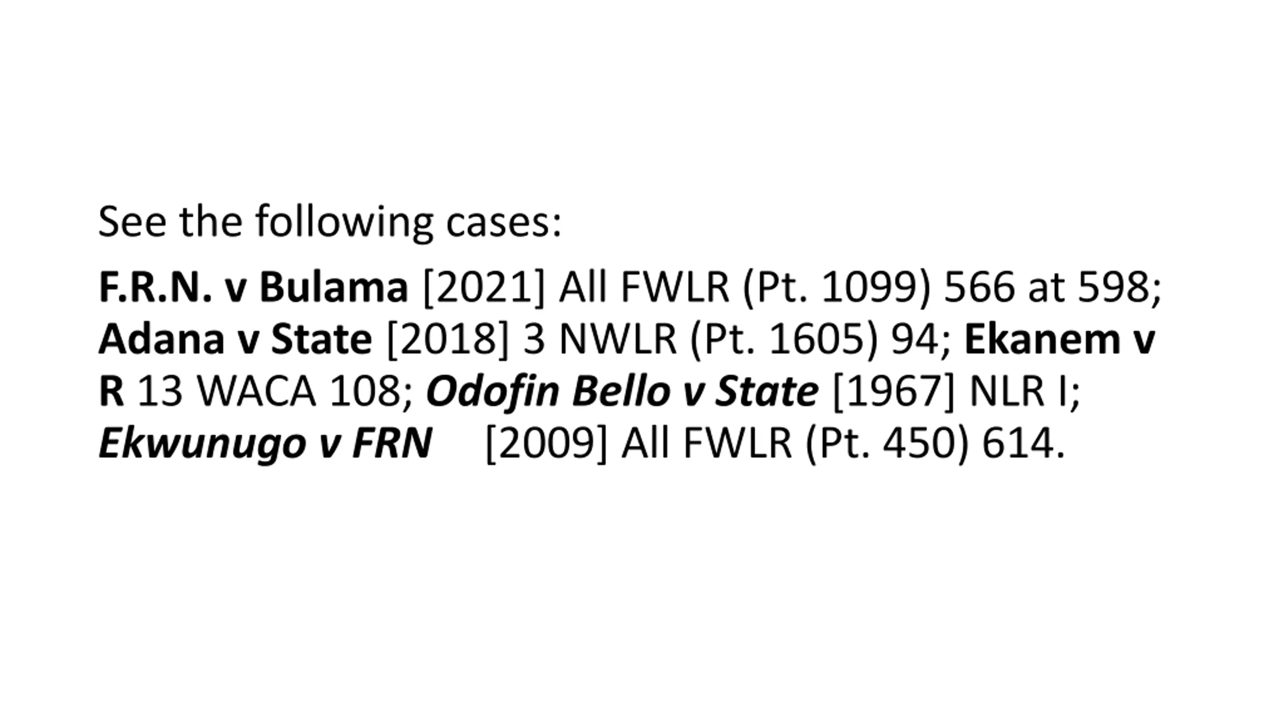 See the following cases: F.R.N. v Bulama [2021] All FWLR (Pt. 1099) 566 at 598; Adana v State [2018] 3 NWLR (Pt. 1605) 94; Ekanem v R 13 WACA 108; Odofin Bello v State [1967] NLR I; Ekwunugo v FRN [2009] All FWLR (Pt. 450) 614.