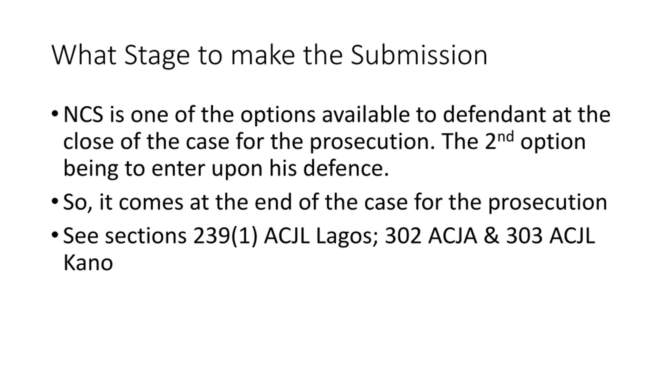 What Stage to make the Submission NCS is one of the options available to defendant at the close of the case for the prosecution. The 2ndoption being to enter upon his defence. So, it comes at the end of the case for the prosecution See sections 239(1) ACJL Lagos; 302 ACJA & 303 ACJL Kano
