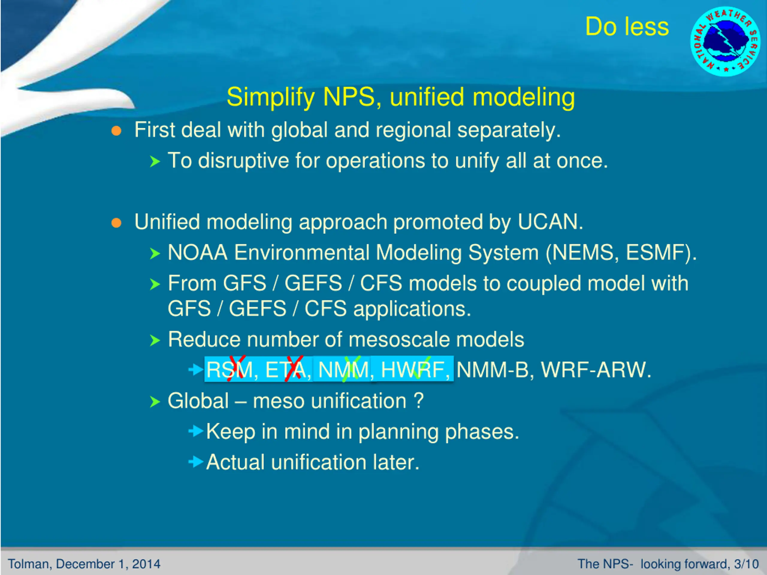 Do less Simplify NPS, unified modeling First deal with global and regional separately. To disruptive for operations to unify all at once. Unified modeling approach promoted by UCAN. NOAA Environmental Modeling System (NEMS, ESMF). From GFS / GEFS / CFS models to coupled model with GFS / GEFS / CFS applications. Reduce number of mesoscale models RSM, ETA, NMM, HWRF, NMM-B, WRF-ARW. Global meso unification ? Keep in mind in planning phases. Actual unification later. Tolman, December 1, 2014 The NPS- looking forward, 3/10